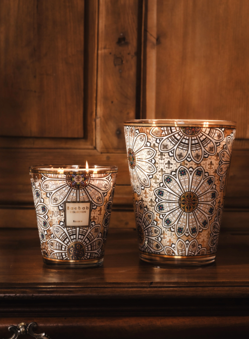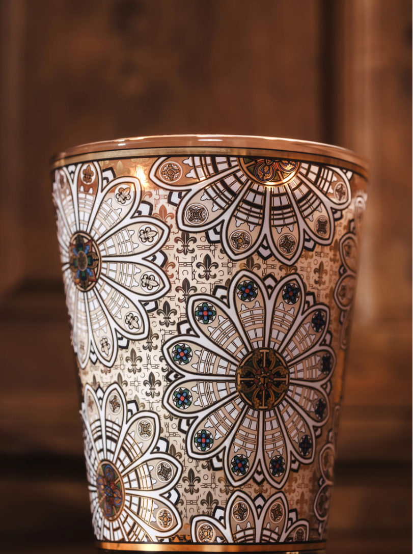 The Rosace candle pays tribute to Gothic architecture and the spiritual light of cathedrals. Its glass is covered with a precious silk-screen print, where gold and subtle colors draw motifs inspired by medieval rose windows. Like luminous lace, this refined décor is set against a background of fleur-de-lis, an emblem of nobility and purity.