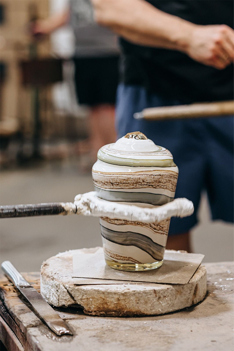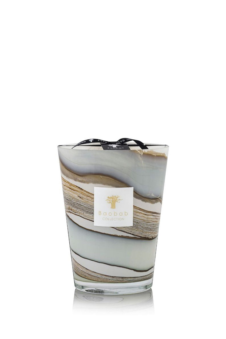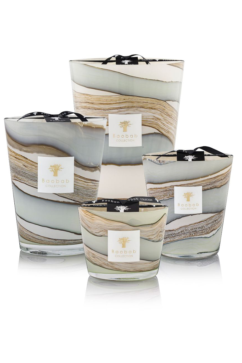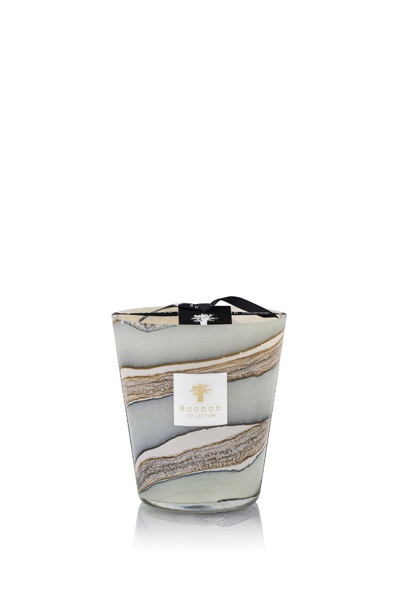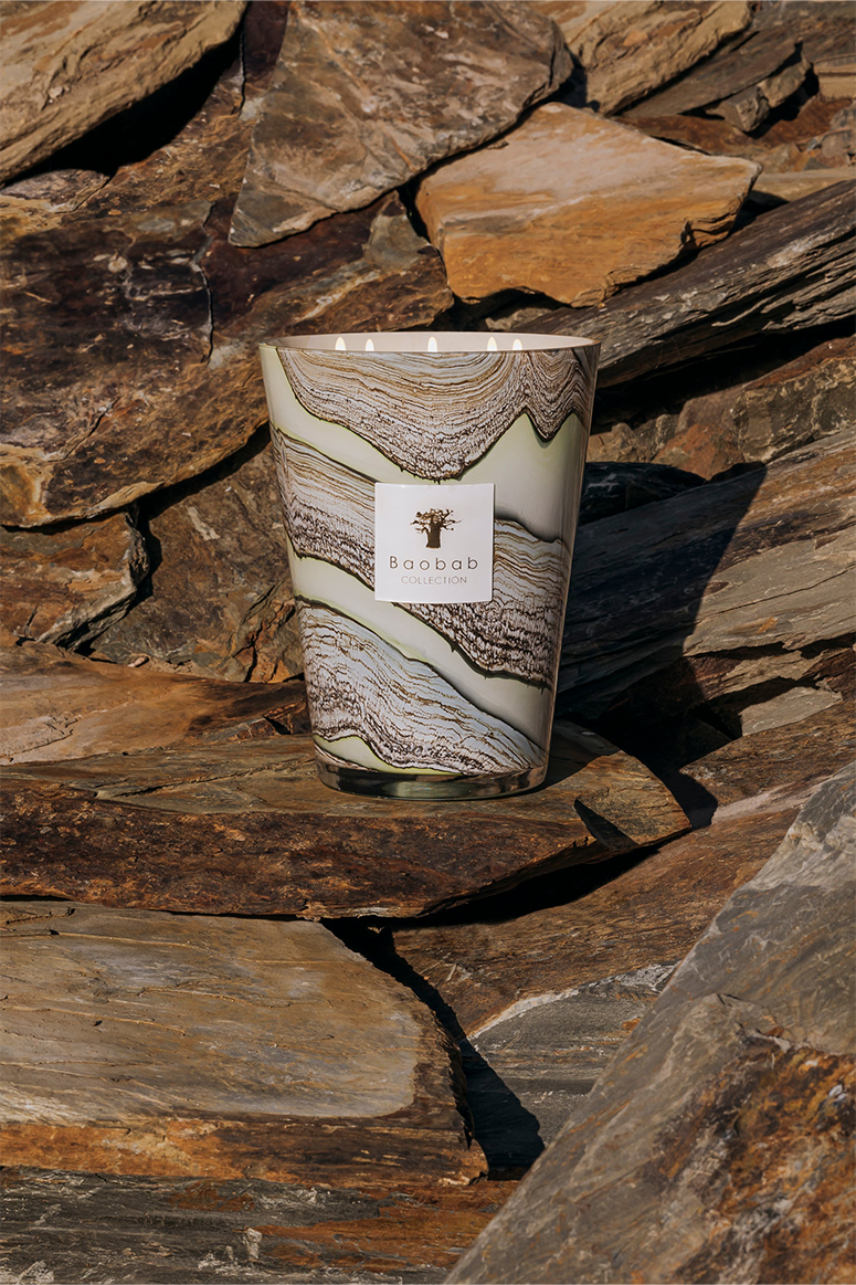 The Sonora scented candle is embodied in a highly sophisticated hand-blown glass. The colors that form random lines on the glass are an explosion of refined tones ranging from celadon green to blue-gray shades.