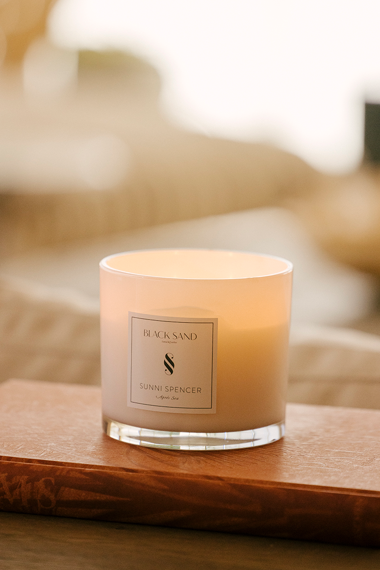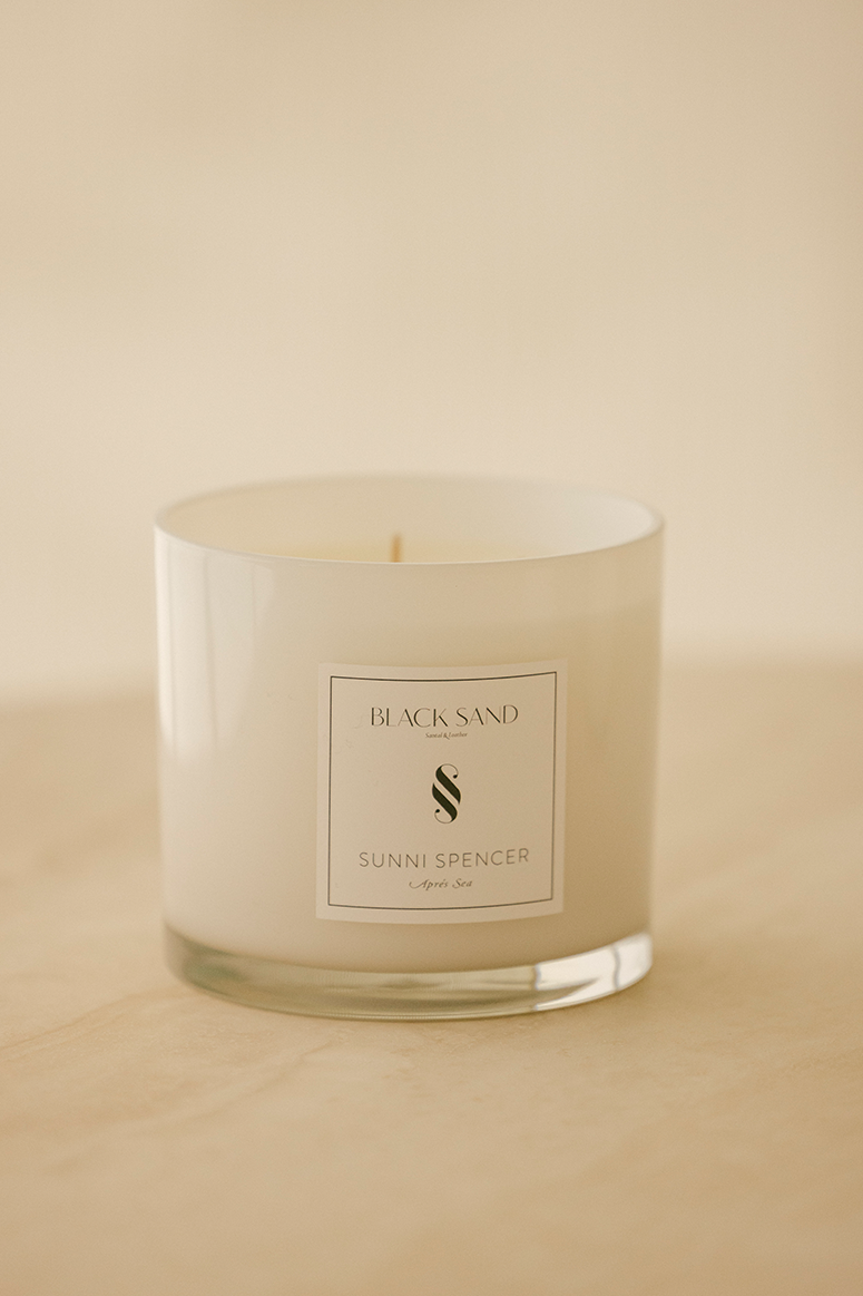 The first namesake Sunni Spencer “Après Sea” candle collection. The BLACK SAND scent has notes of Santal, Amber, Musk, and Leather evoking the feeling of putting your feet up in the villa and relaxing after a day on the ocean. The glass vessels are each unique in shape variation and can be used as home decor that can be repurposed in your home after using. Great for tabletop book styling as well.