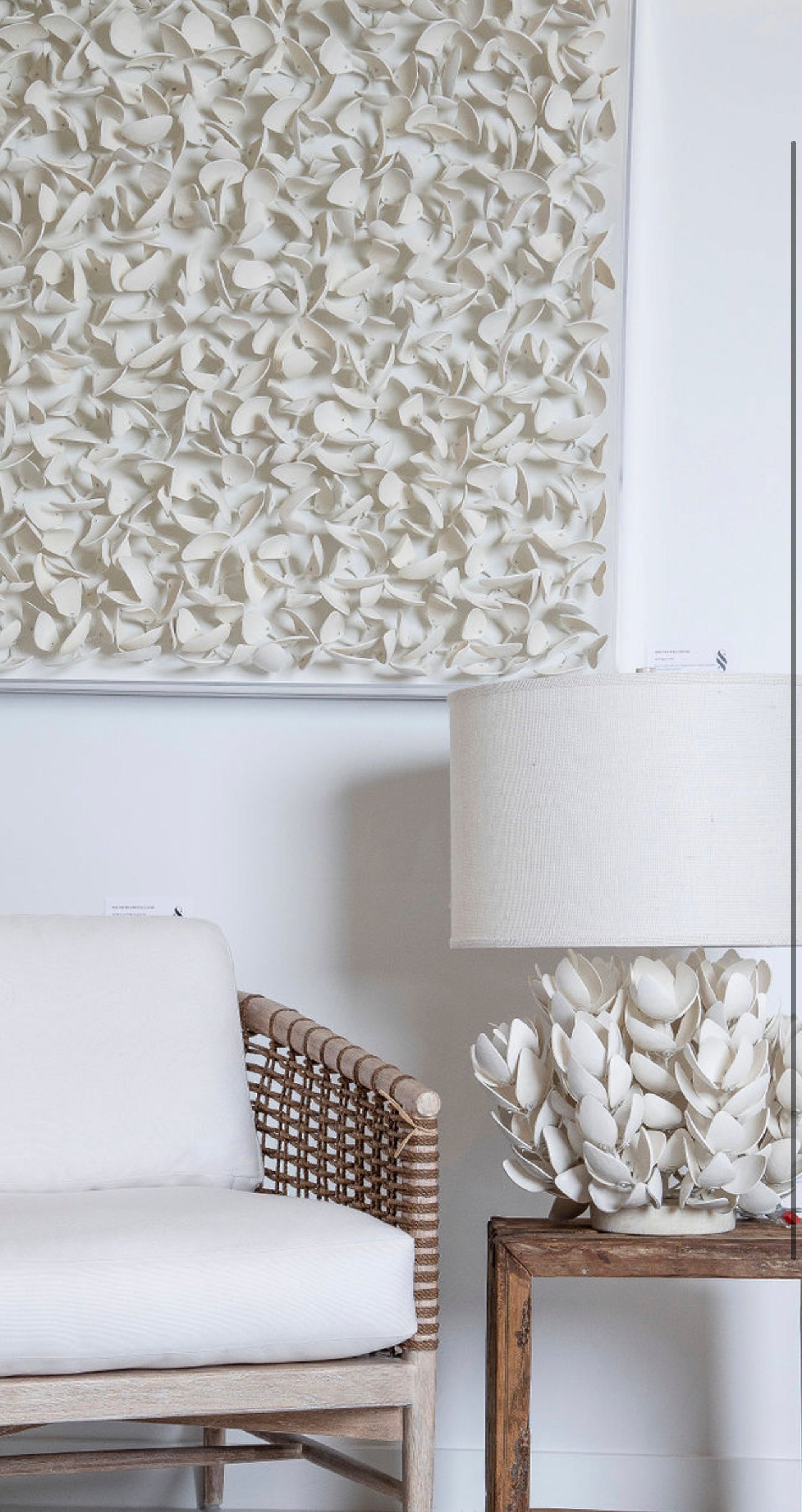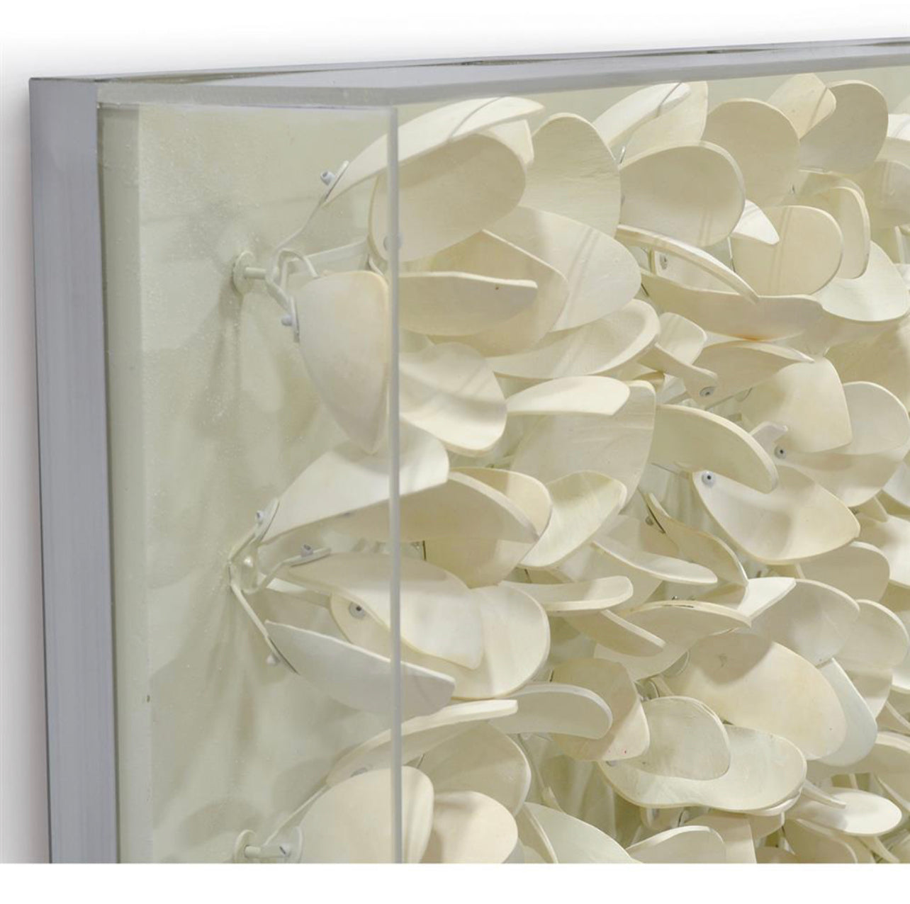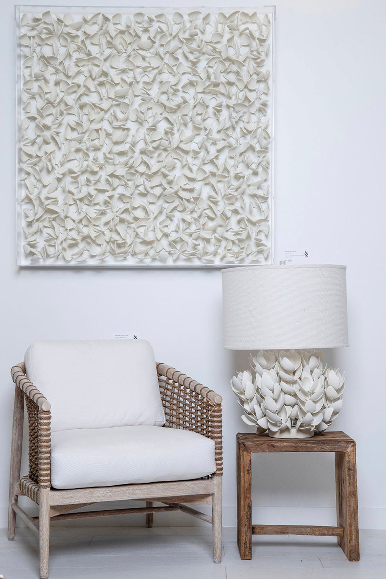 Like lily pads afloat on the pond in Giverny, these delicate coco wood flowers gracefully gather inside a clear acrylic frame. The small, cream-colored floral sculptures create a neutral palette inside the modern square. Free shipping within the USA.