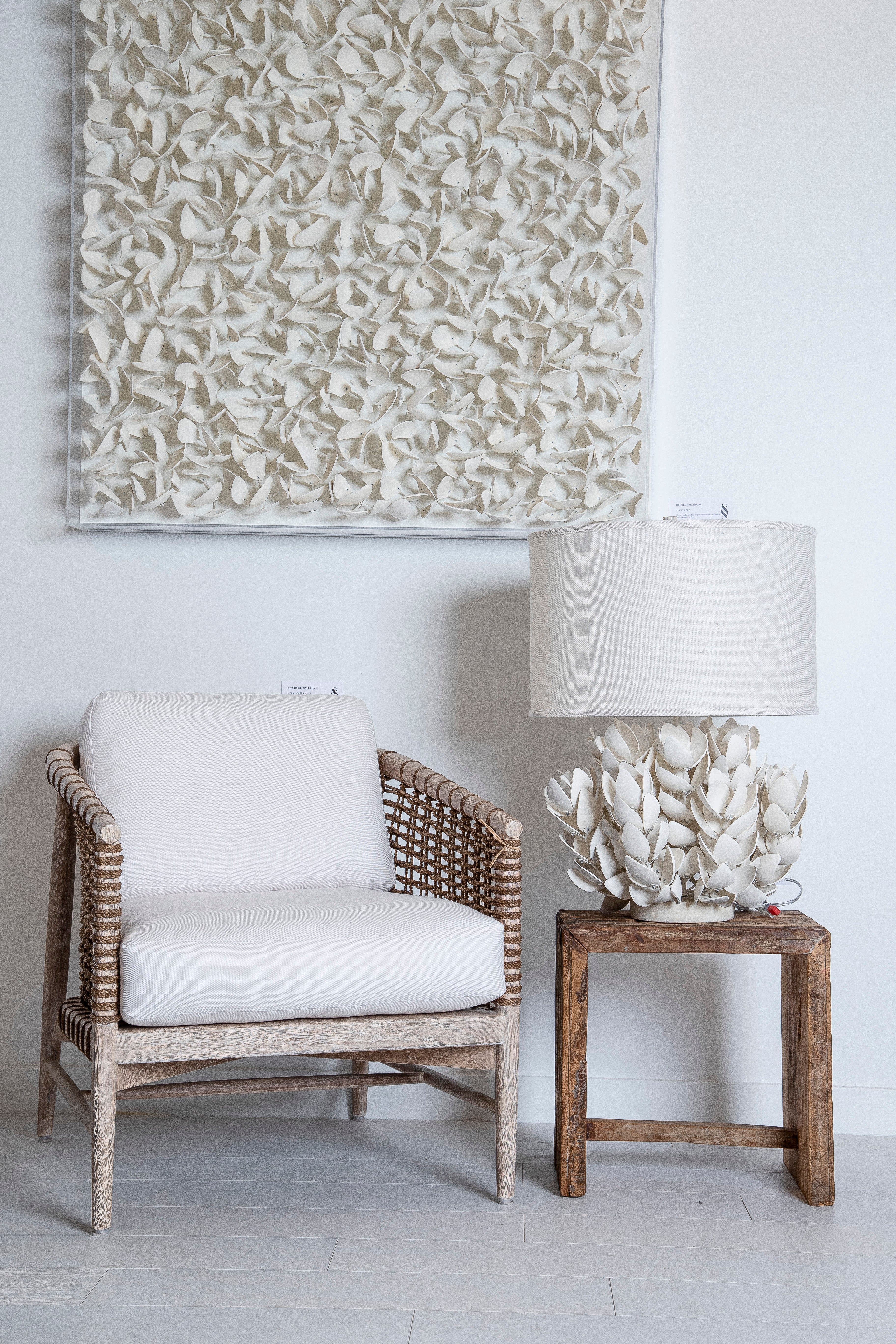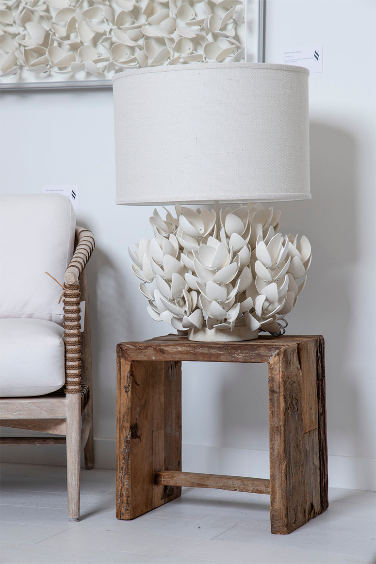 Pre-order for special order! Hand- cut coconut shells in petal forms in an off white finish. The lamp shade is a cream burlap in round drum shape and an inland shell finial. Natural markings and indentations are part of the inherent beauty of coconut shells and add interest to the piece.