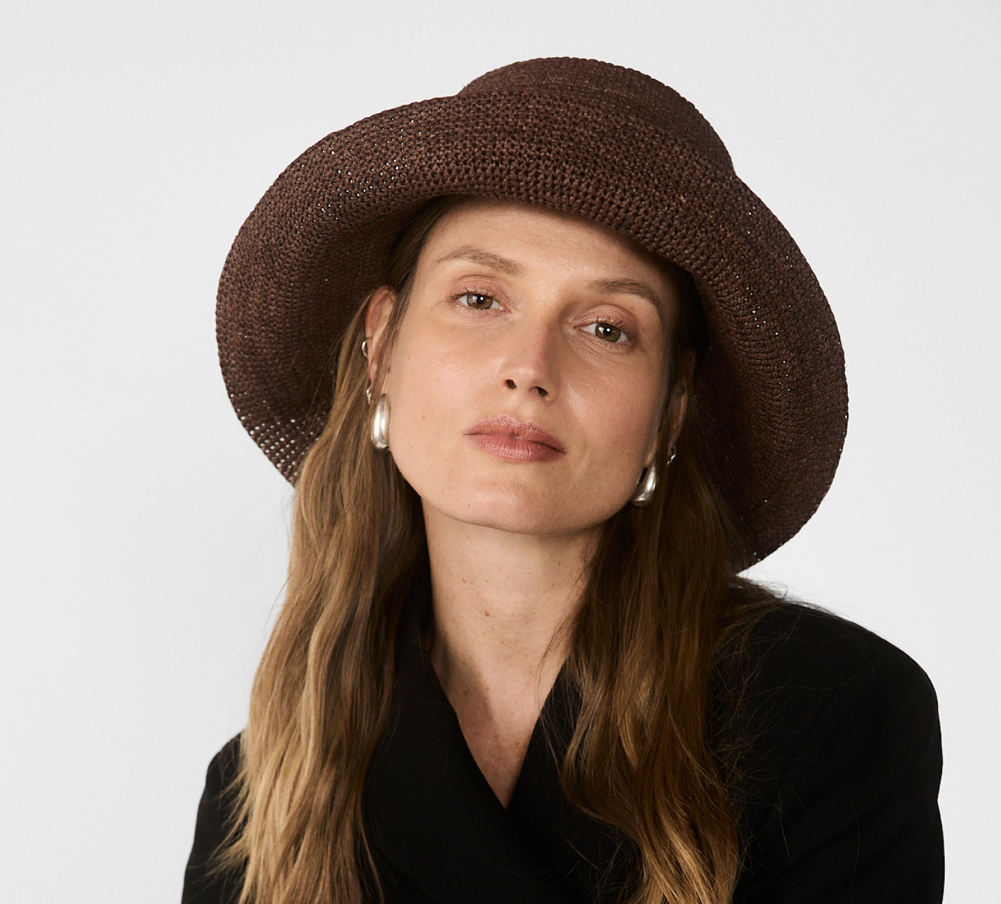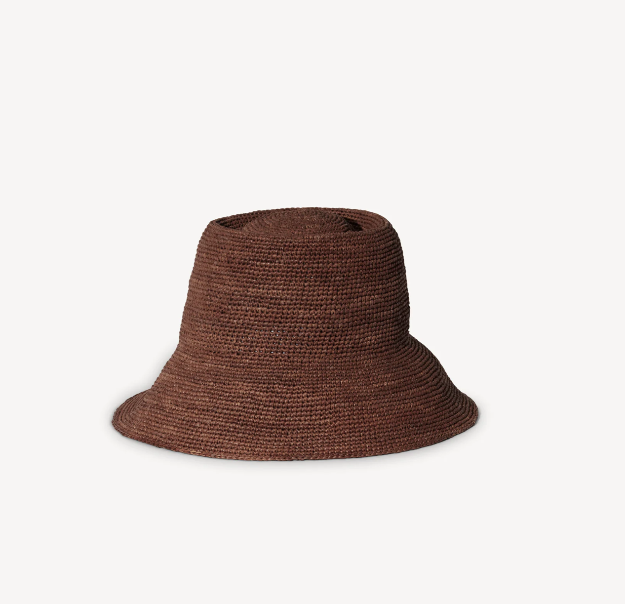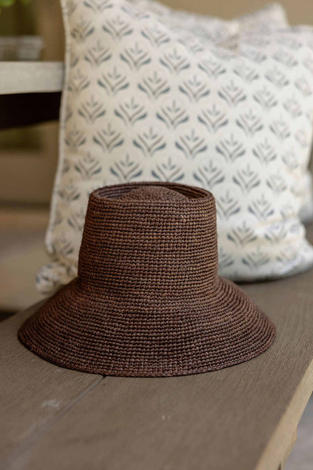 A raffia straw bucket hat made for summer. This short-brimmed crochet bucket hat was intricately crocheted to create a flexible and structured design. This effortless bucket hat can easily be worn year-round and is meant for traveling with you wherever you go whether in a suitcase, a purse or a beach bag.