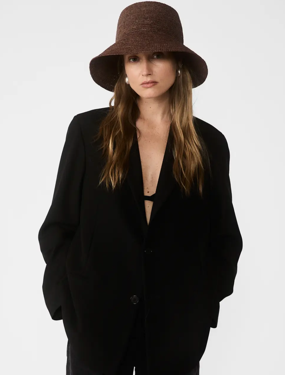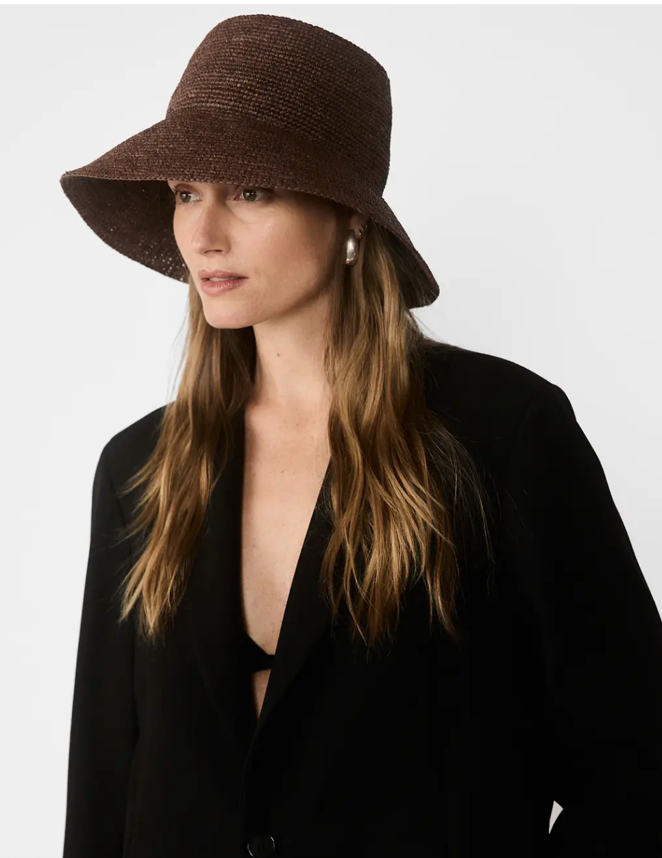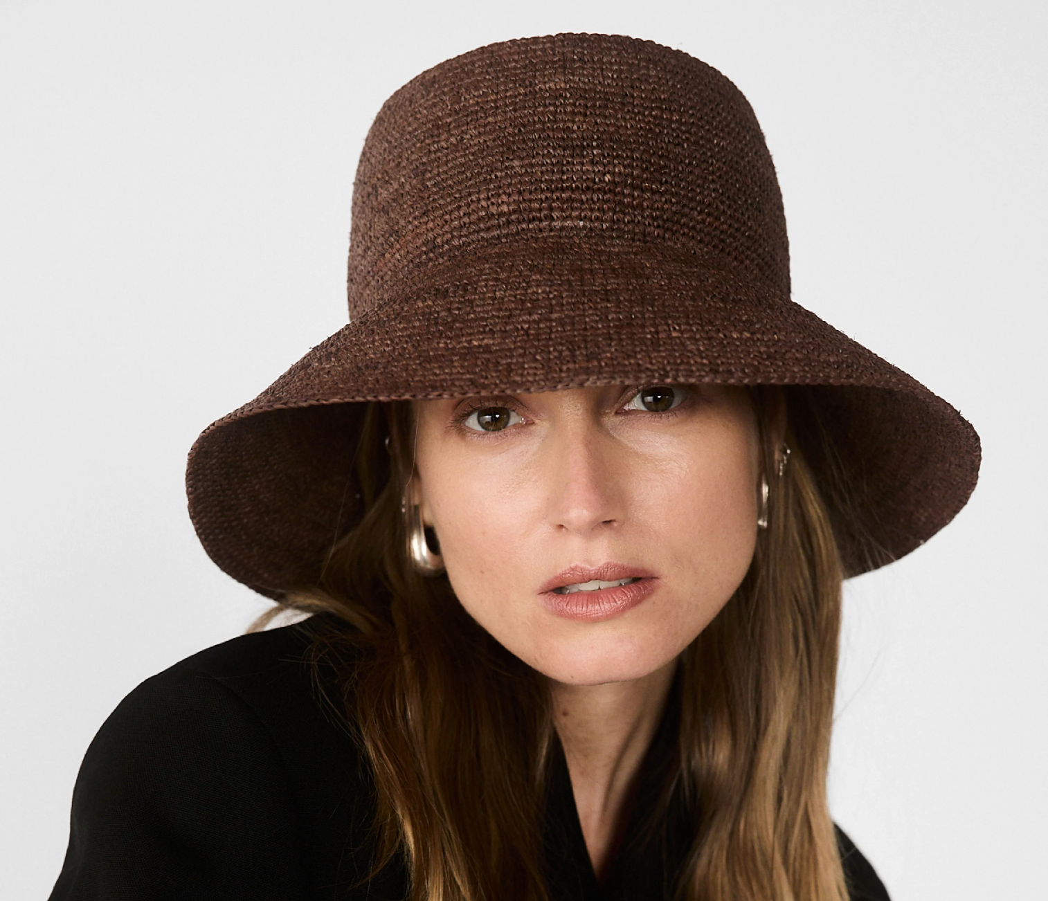A raffia straw bucket hat made for summer. This short-brimmed crochet bucket hat was intricately crocheted to create a flexible and structured design. This effortless bucket hat can easily be worn year-round and is meant for traveling with you wherever you go whether in a suitcase, a purse or a beach bag.
