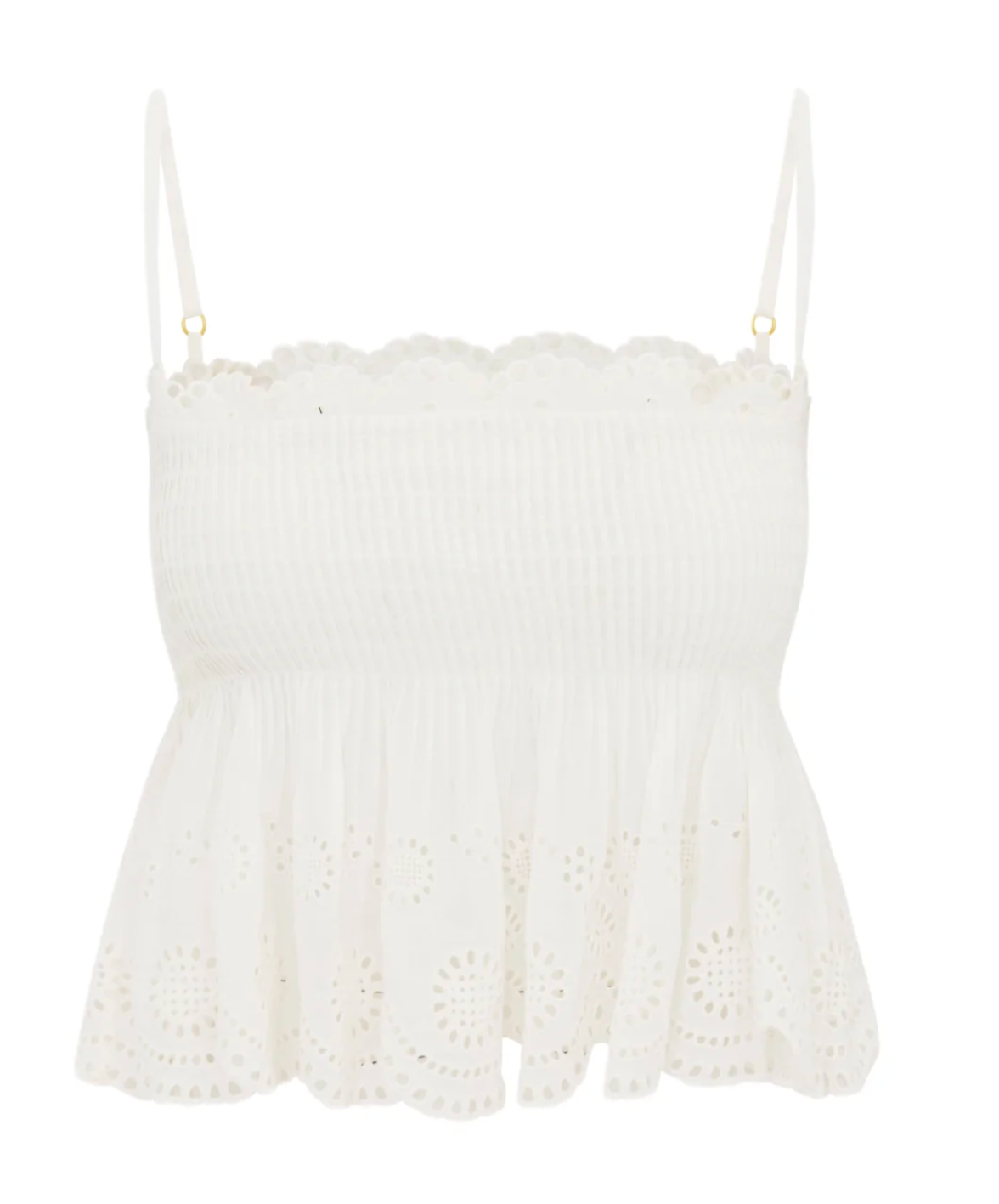 Effortlessly chic in the Condie Top. Designed from an airy cotton, this pretty piece arrives with a beautiful medley of custom-made, large-scale scallop floral eyelet details mixed with smaller eyelets. The smocked top features adjustable spaghetti straps and releases into a peplum hem for a feminine finish.