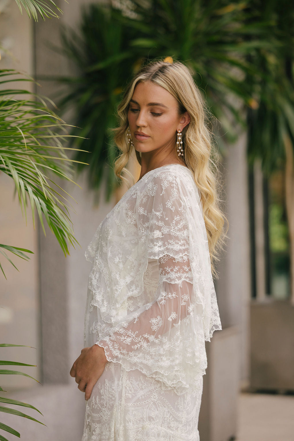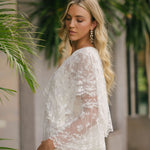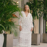 Introducing the Roylan Dress. This full-length, Bohemian-inspired gown stuns with delicate, embroidered flowers dancing amongst a lightweight mesh fabric featuring a gorgeous arrangement of laces throughout. The dress features a plunging V-neckline, two-tiered bell sleeves, and a cape-inspired bodice that ties at the back. The piece includes a separate chiffon slip lining that’s length is shorter than the dress to be worn underneath if desired.