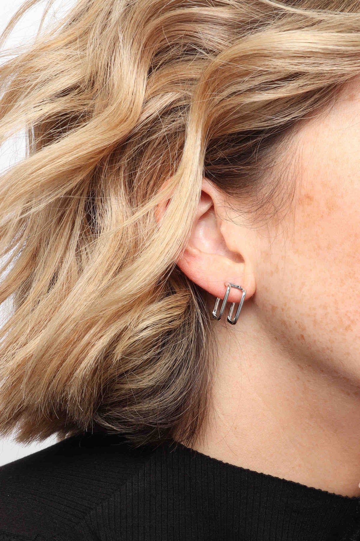A subtle conversation starter that is sure to receive double-takes, our best-selling Stevie Hoop is a funky hoop that you will never tire of. Featuring a stainless steel base, this geometric style is designed to gain compliments from all angles — and is hypoallergenic and water-resistant. A three-dimensional open square concept poses as a double piercing earring, with just one singular post closure. Complimented with our custom cylinder earring backings — this lightweight earring is a fabulous design to take you from day to night with ease and edge.
