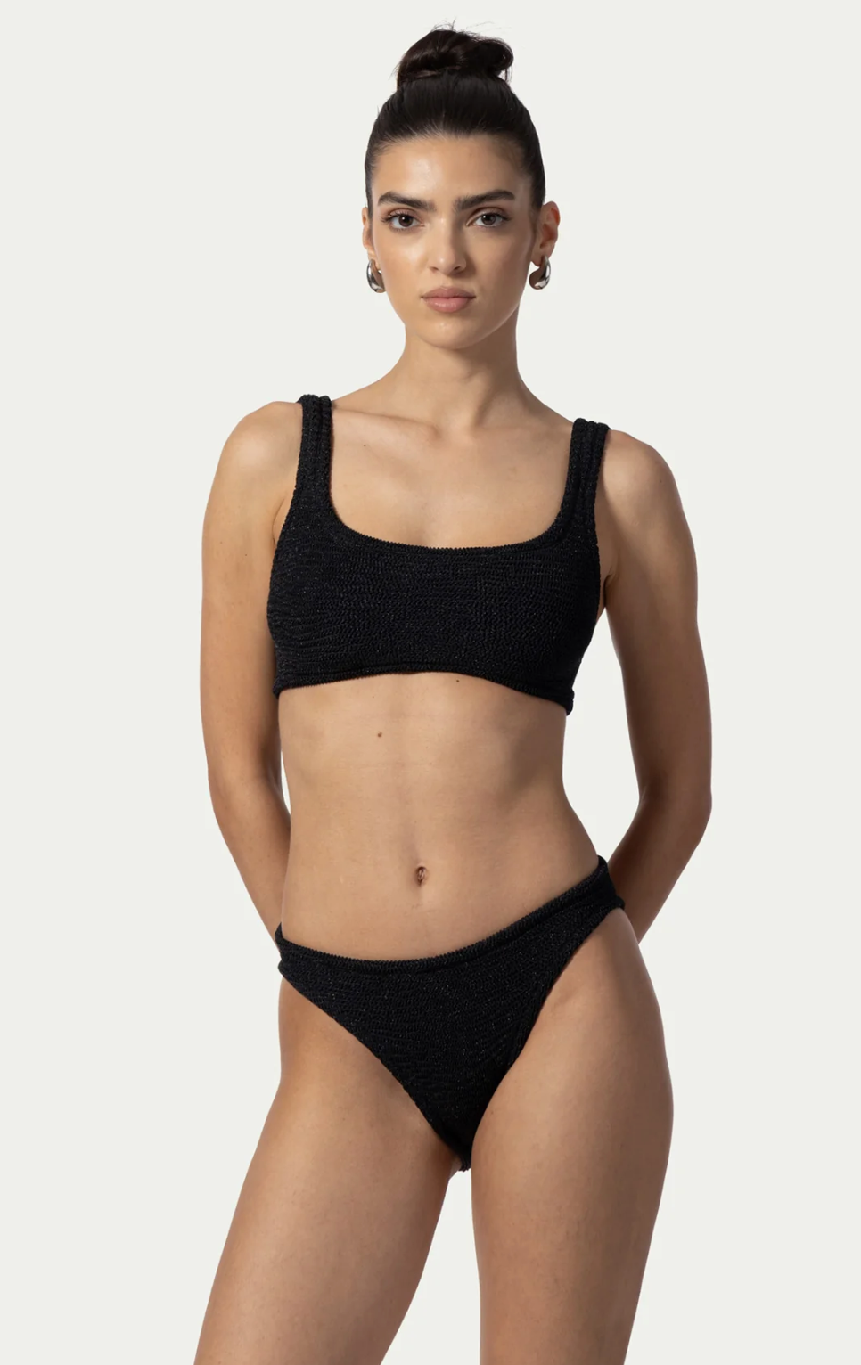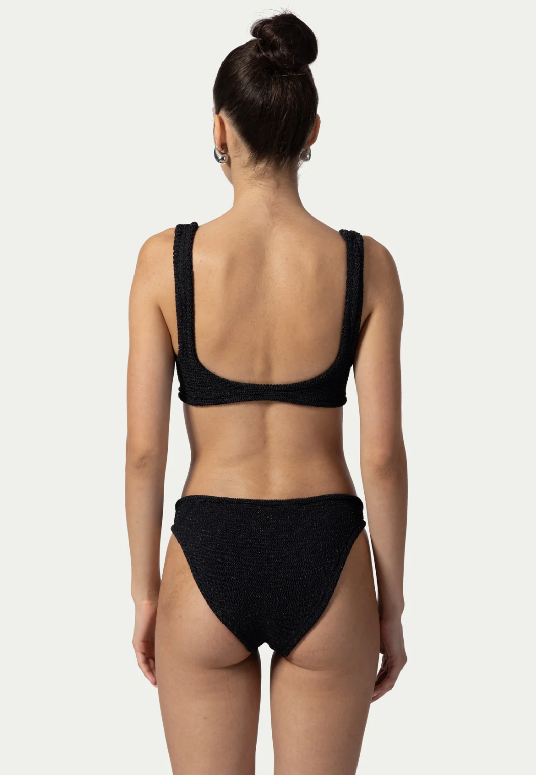 Two-piece EMILY BLACK LUREX swimsuit by PARAMIDONNA. Designed in a universal size, it fits sizes XS to 2X. The top features a strappy sporty bustier, while the mid-cut, low-waisted bikini bottoms offer comfort and style. The EMILY model provides support, comfort, and extra coverage, making it a versatile and flattering choice for all body types.