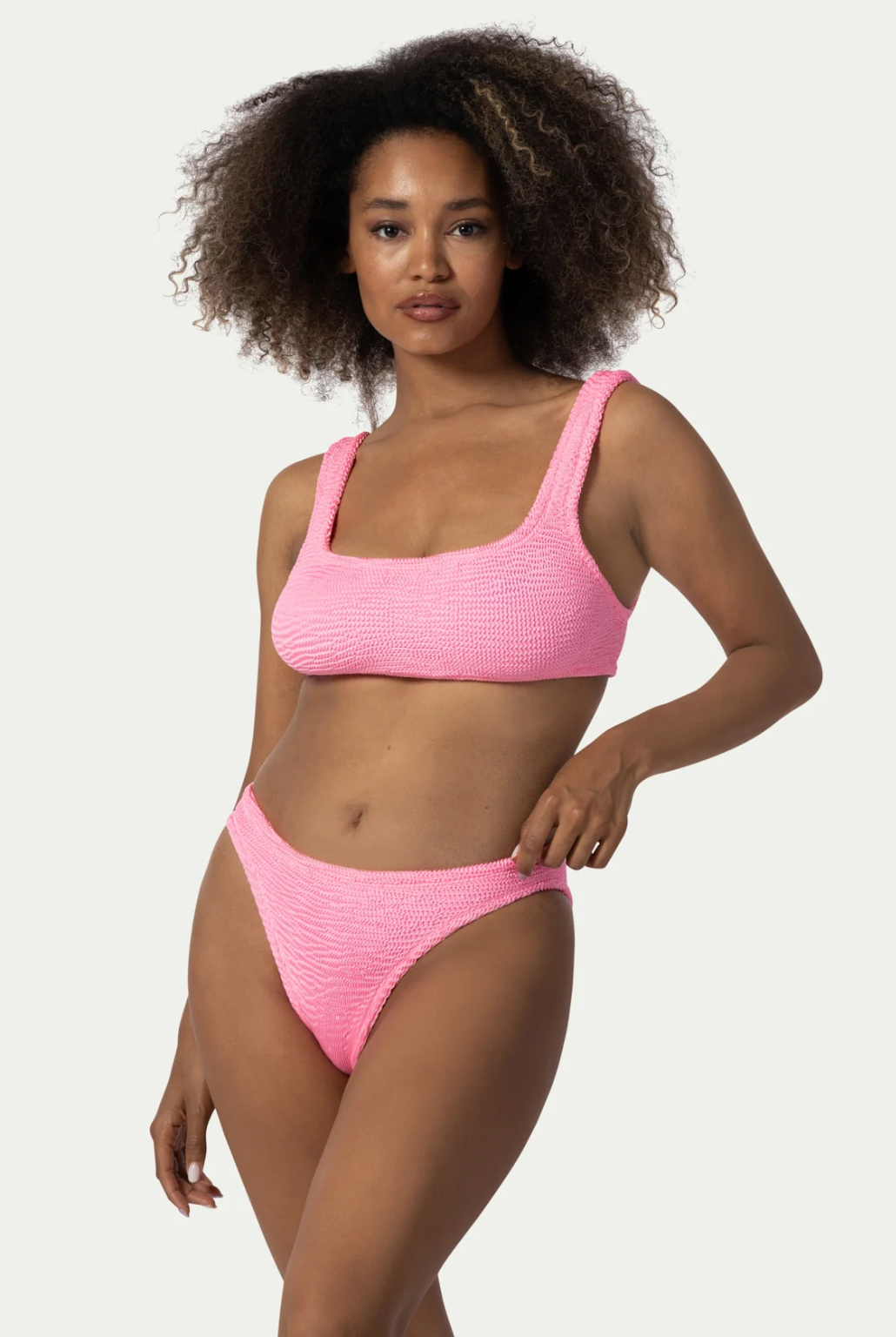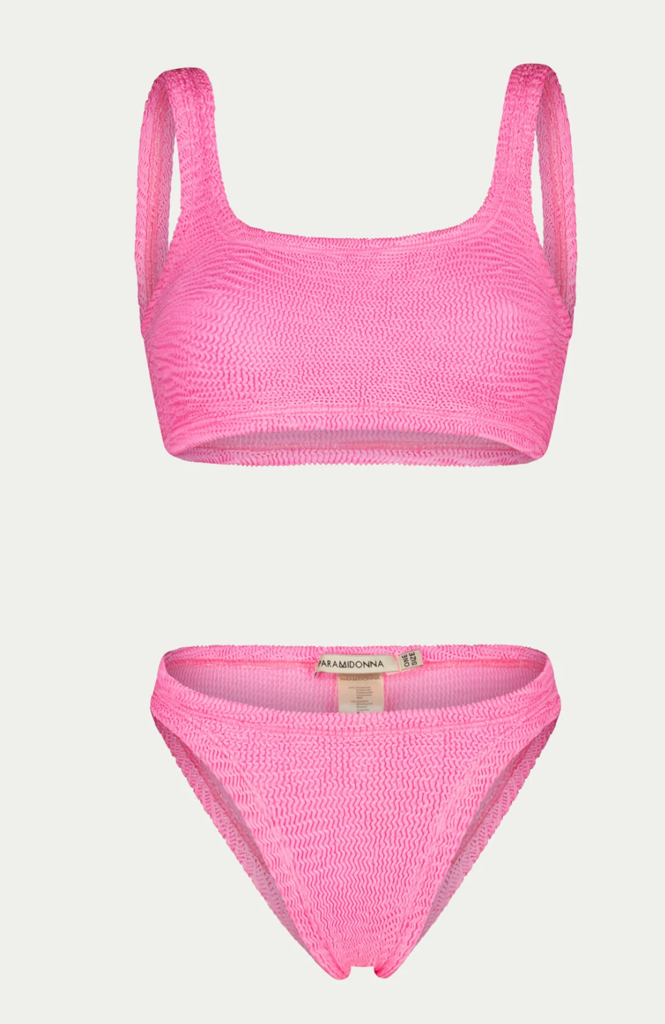 Two-piece EMILY BUBBLE GUM swimsuit by PARAMIDONNA. Designed in a universal size, it fits sizes XS to 2X. The top features a strappy sporty bustier, while the mid-cut, low-waisted bikini bottoms offer comfort and style. The EMILY model provides support, comfort, and extra coverage, making it a versatile and flattering choice for all body types.