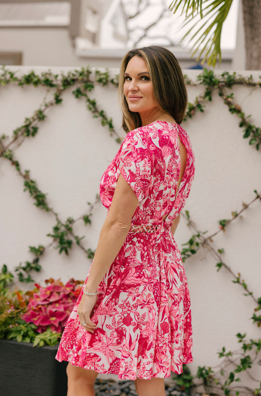 A take on bold floral prints in this mini style in with unique accents. The loose sleeves and cross fabric on the cut-out waist add a refreshing appeal, while the plunging neckline and pleated details reveal a hint of sophistication. An eye catching piece that's perfect to elevate your summer wardrobe.