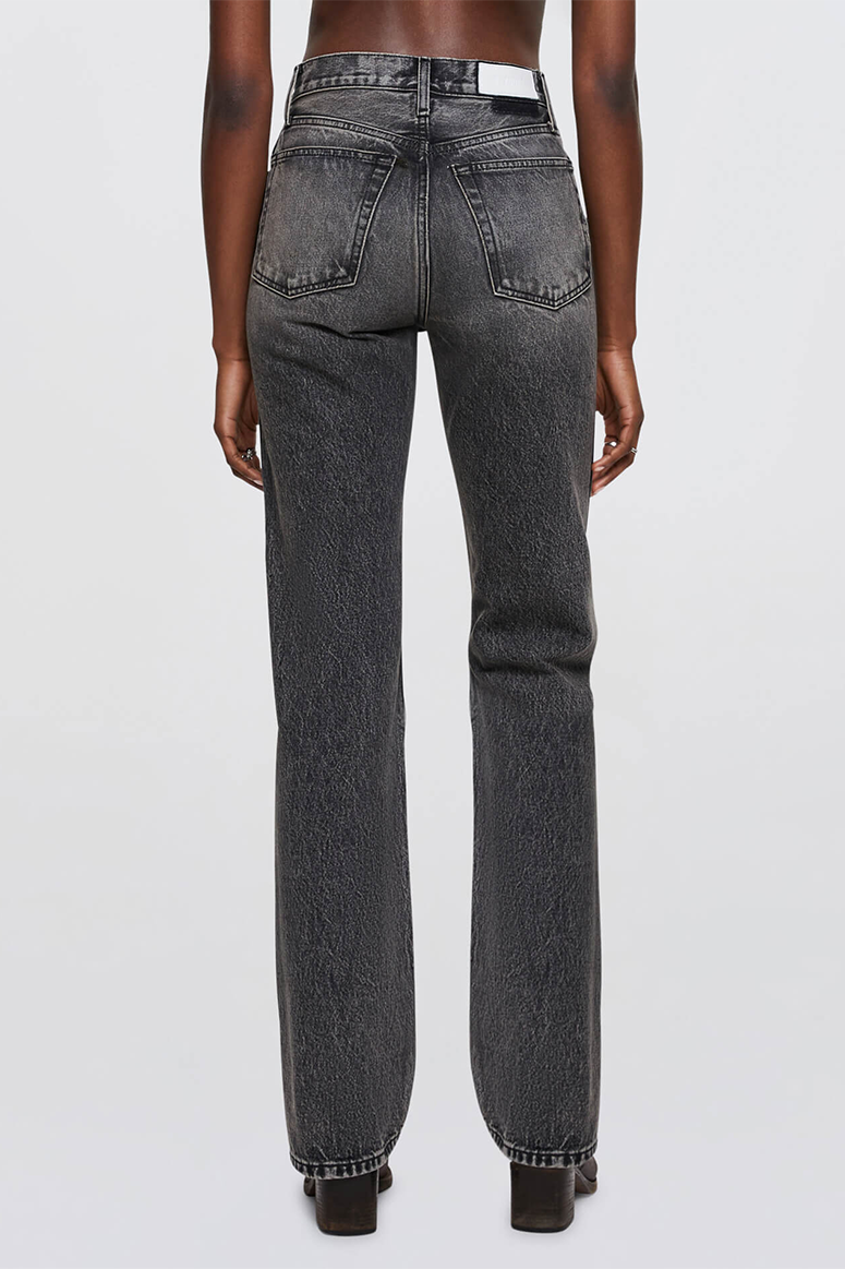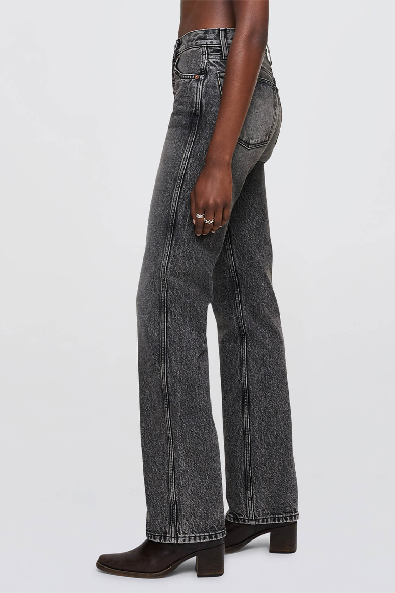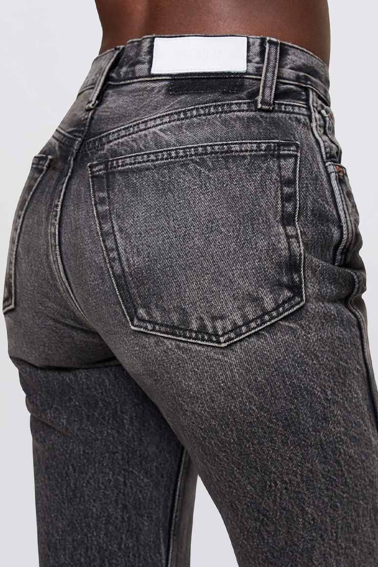 The 90s High Rise Loose in smoke is a take on the iconic long and loose denim from the 90s. Features a vintage inspired stone wash on black rigid fabric, classic button fly and finished hem.
