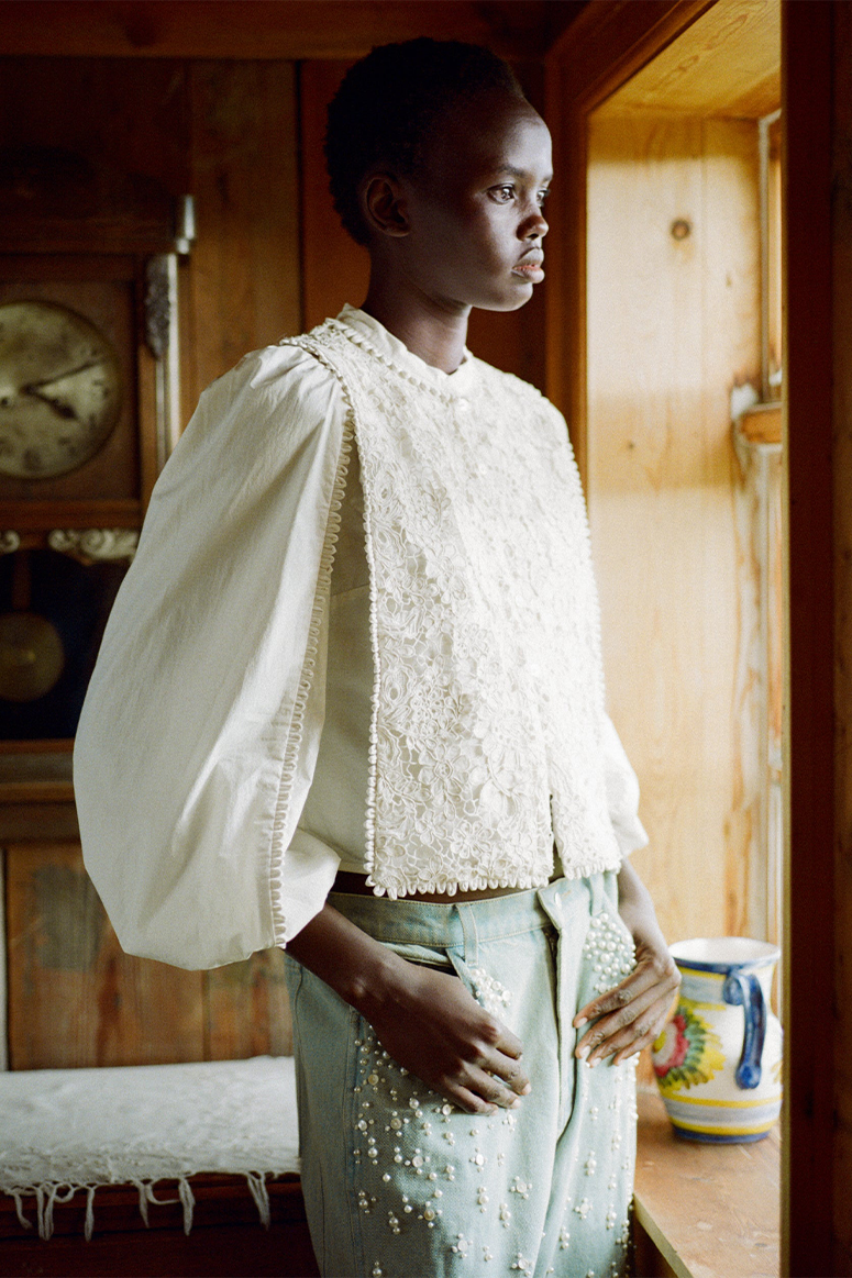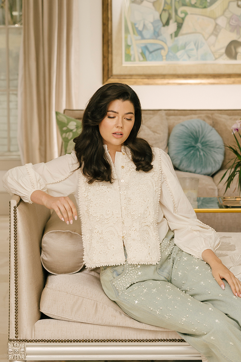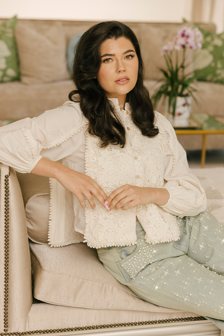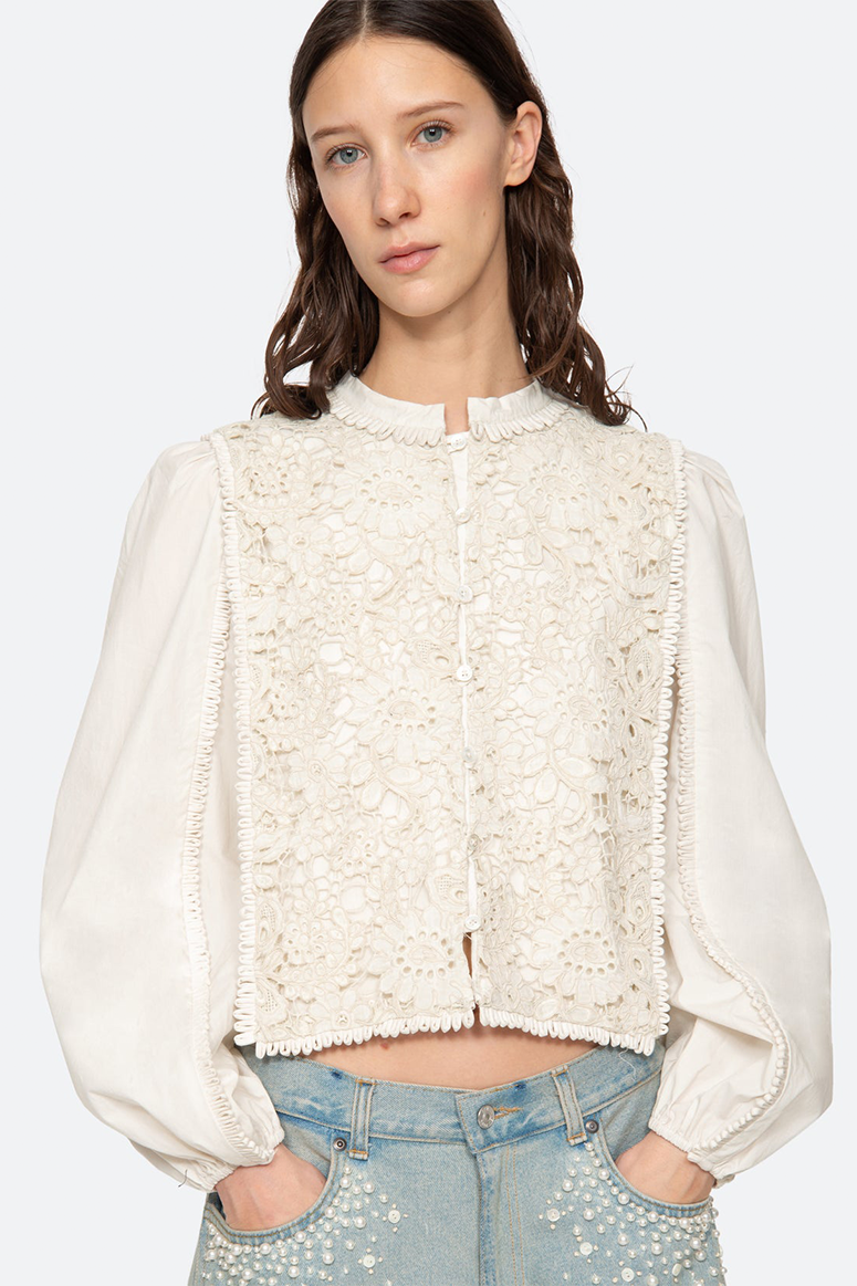 The Sabine embroidered top features lace applique embroidery throughout the body and long puff sleeves.