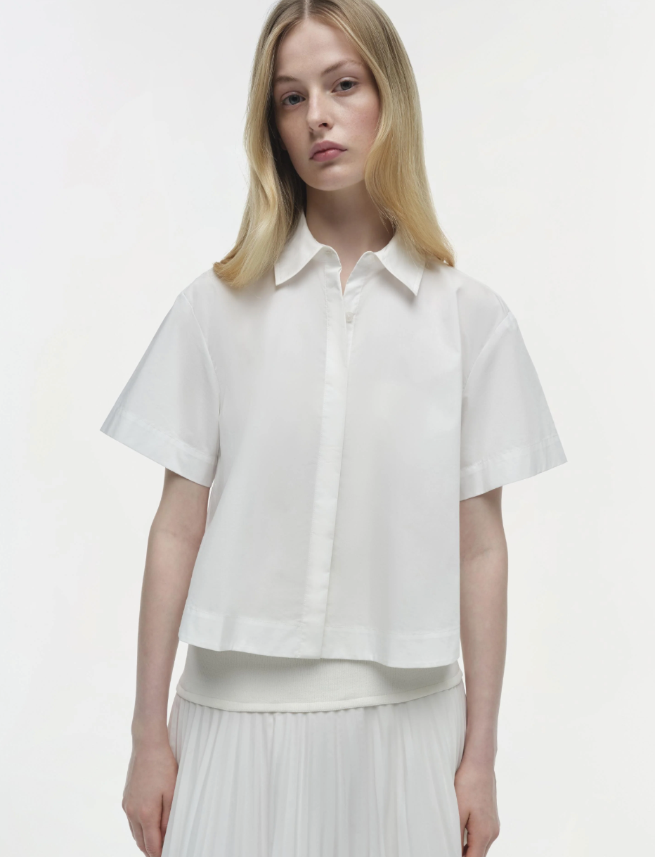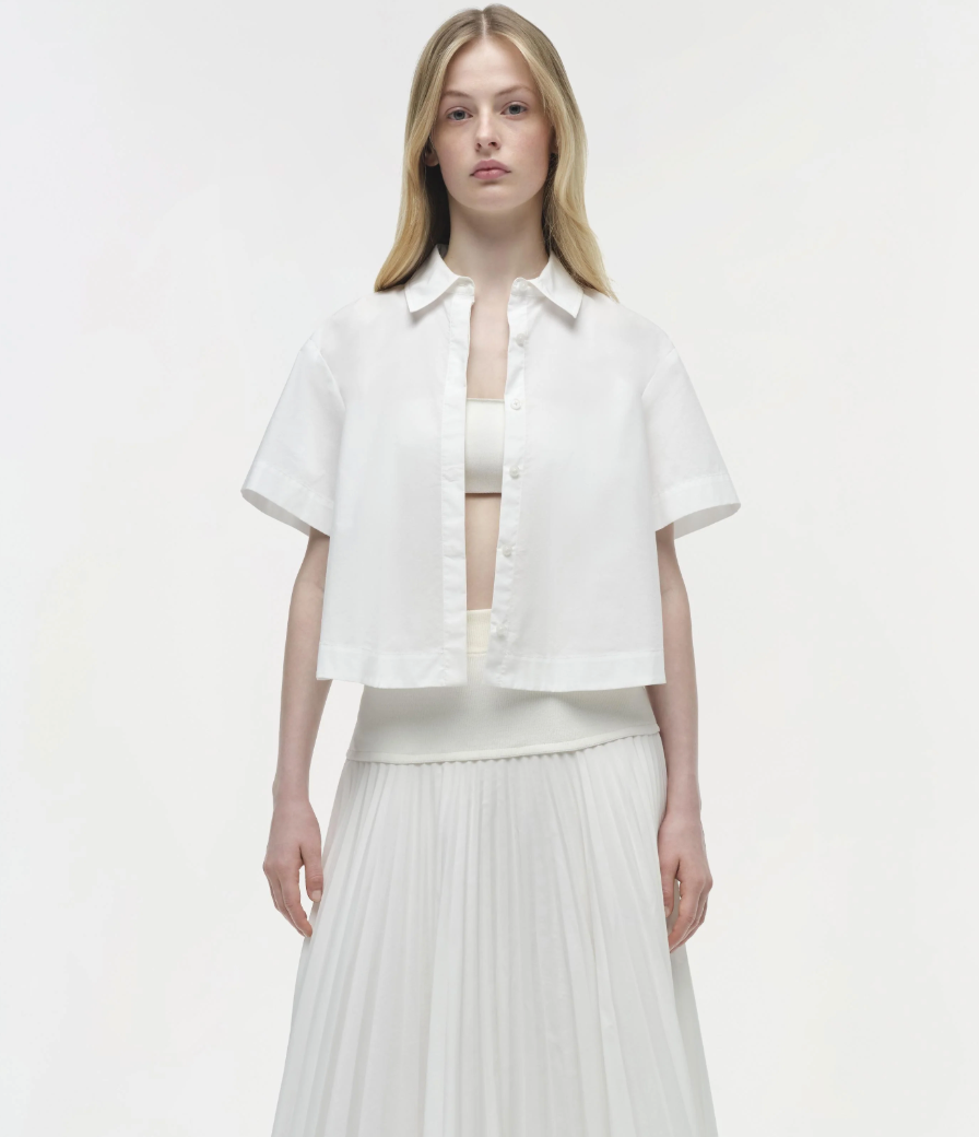 The Bernie Cotton Pleated Shirt in White. Crafted from pleated poplin, this short-sleeve shirt features a crisp silhouette with refined pleat detailing for a polished, modern aesthetic.