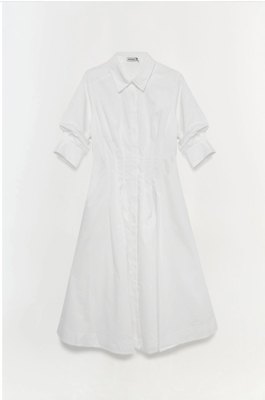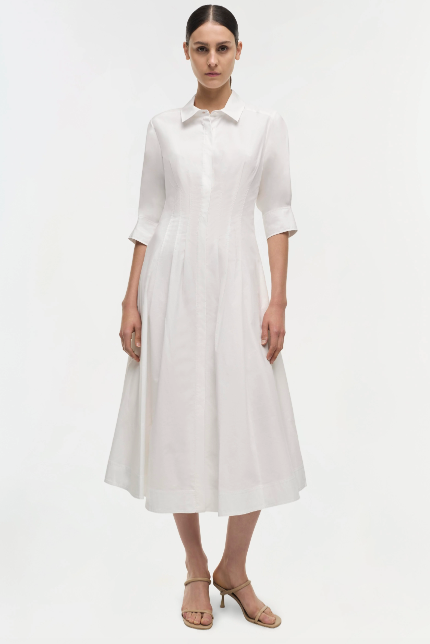 The Jazz Dress in White. Sharp, shirting inspired designs accentuate a pintucked waist, cuffed sleeves and a classic midi length hemline.