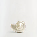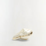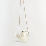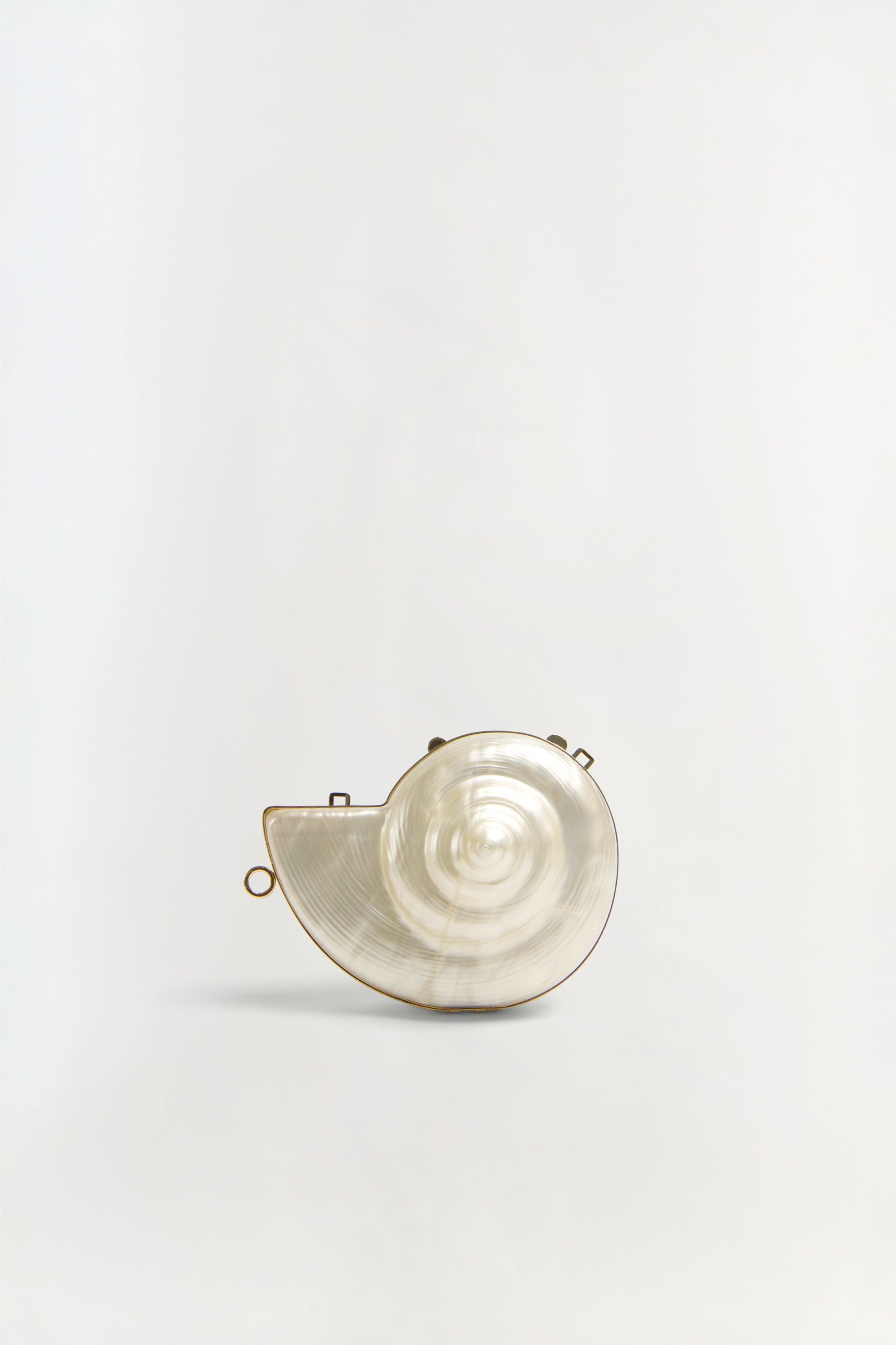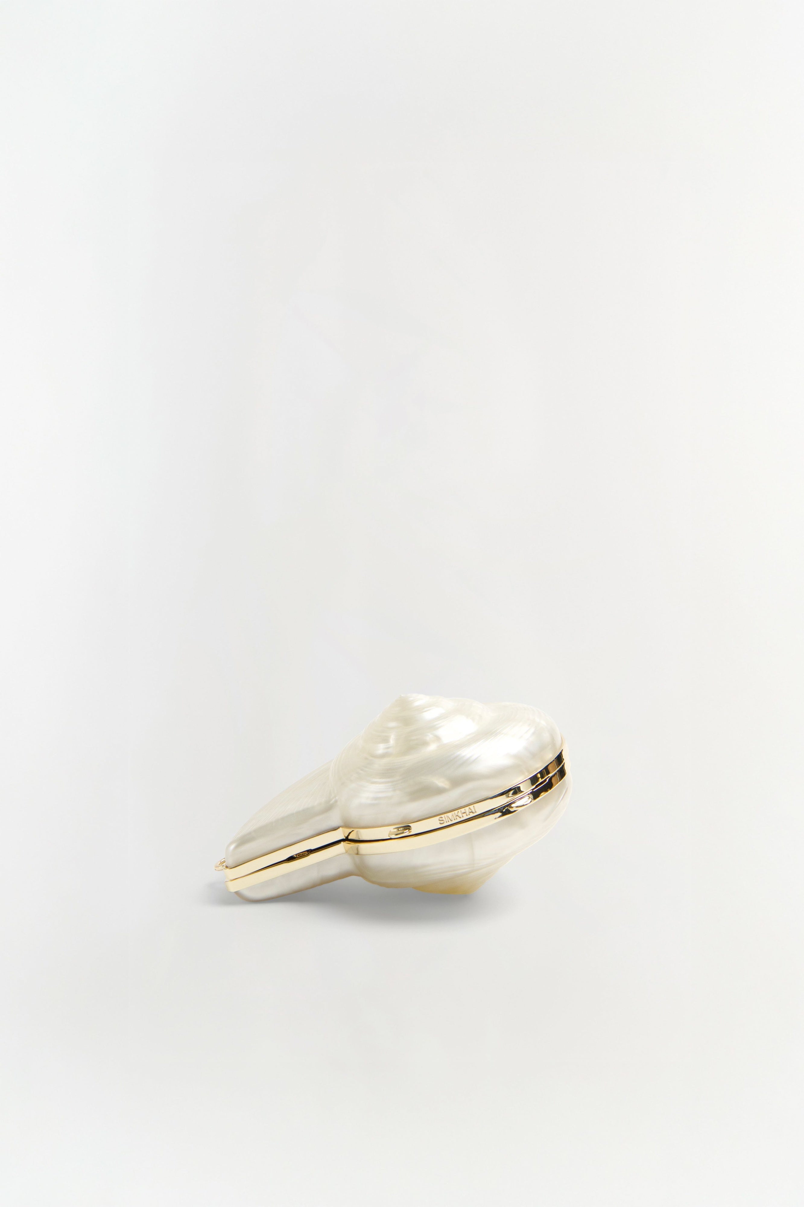 A luminous clutch that captures the spirit of the sea in an iconic spiral silhouette. Its glossy shell-like exterior is trimmed with polished metal and opens to a compact interior with a magnetic clasp. Finished with a detachable chain strap, it transitions seamlessly between statement piece and evening essential.