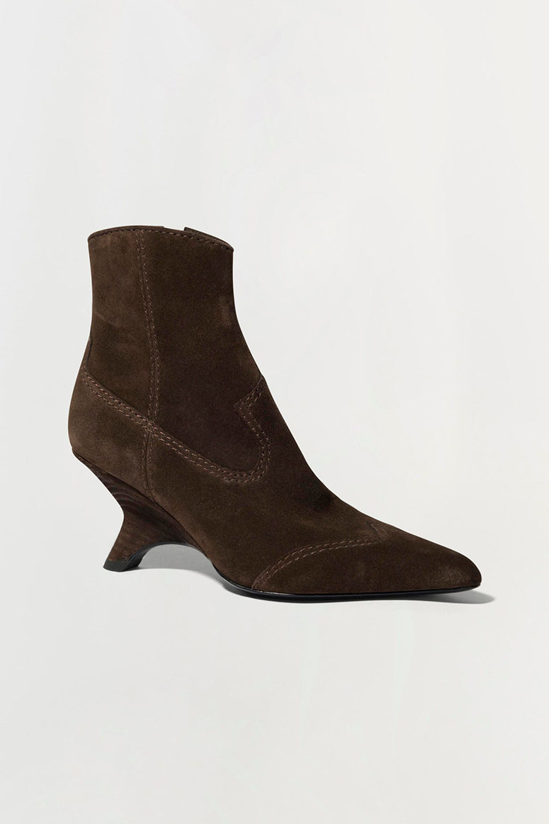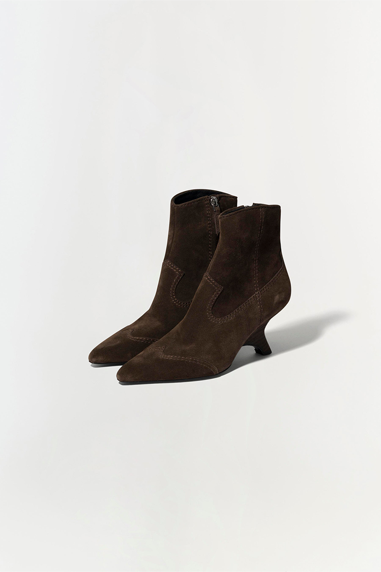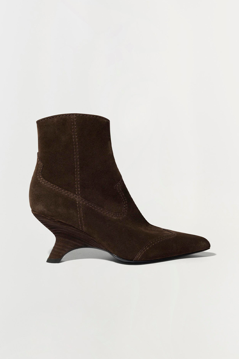 The Shadow Western Boot in Cacao. Featuring a sleek pointed toe and distinctive stitching, these western suede boots are perfect for adding a touch of rugged elegance to your ensemble.