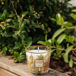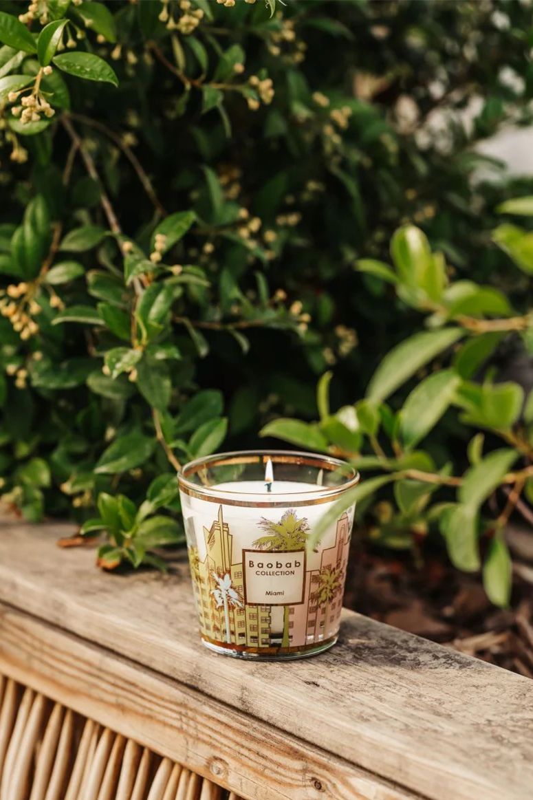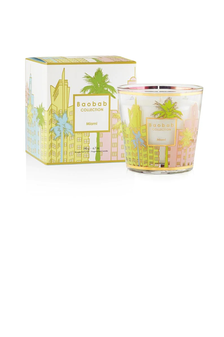 The Miami scented candle is decorated with a pastel and gold silkscreen print that mimics the architecture of South Beach's art deco buildings.