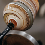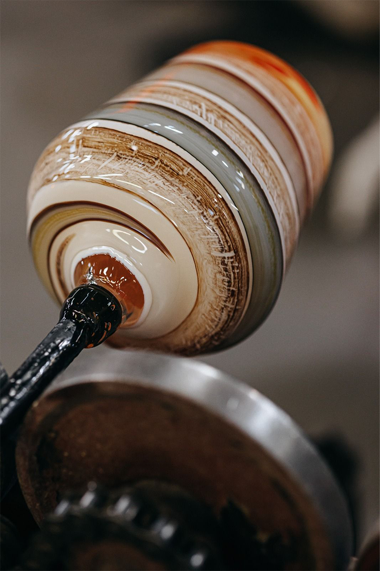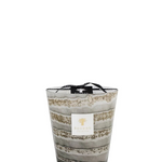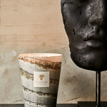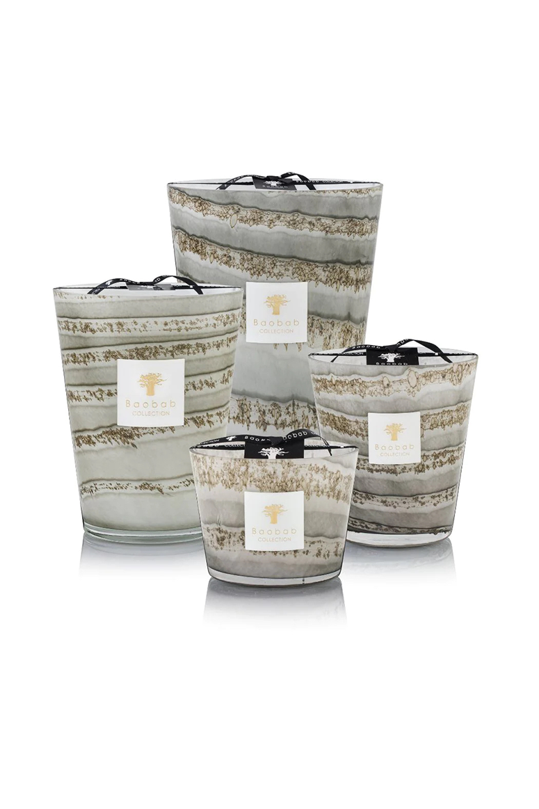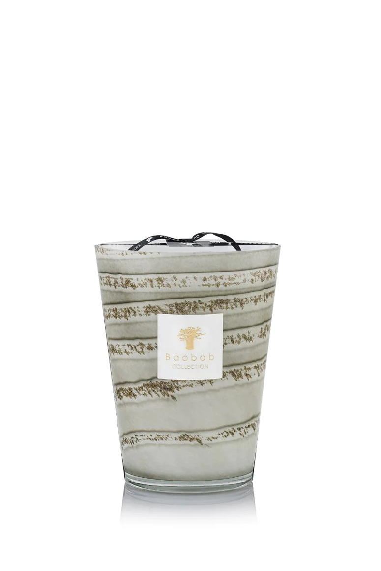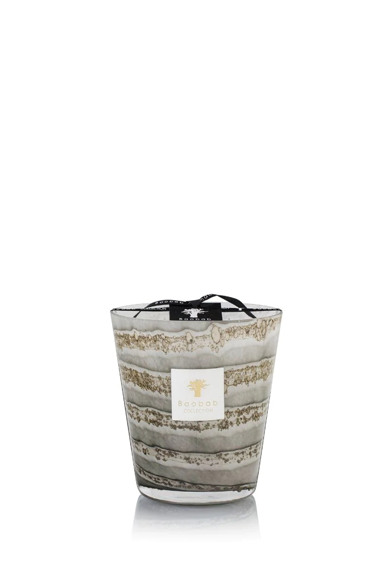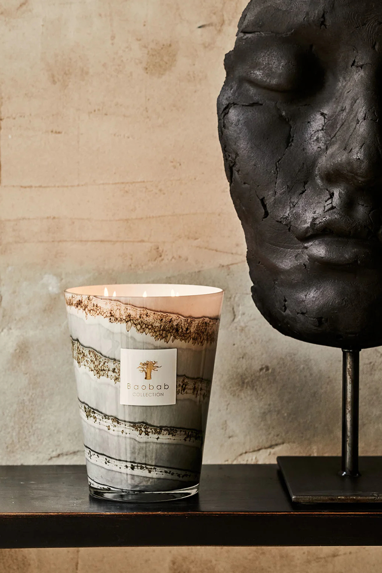 A hand-blown glass with subtle shades of gray was made by our glass artisans. Horizontal strata form gray stripes dotted with small round and organic shards. The Atacama scented candles are refined objects perfect for urban and chic interiors.