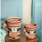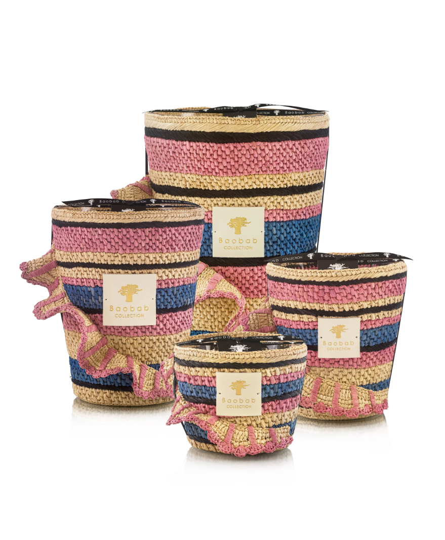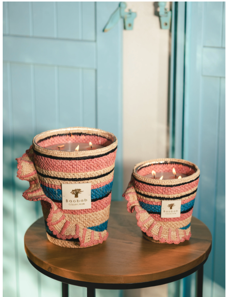 Covered in raffia crocheted with pink and sky-blue stripes, the Mandihy scented candle becomes a decorative object with a festive, humorous look. An embroidered pale pink ruffle is placed diagonally across the candle for a quirky touch.