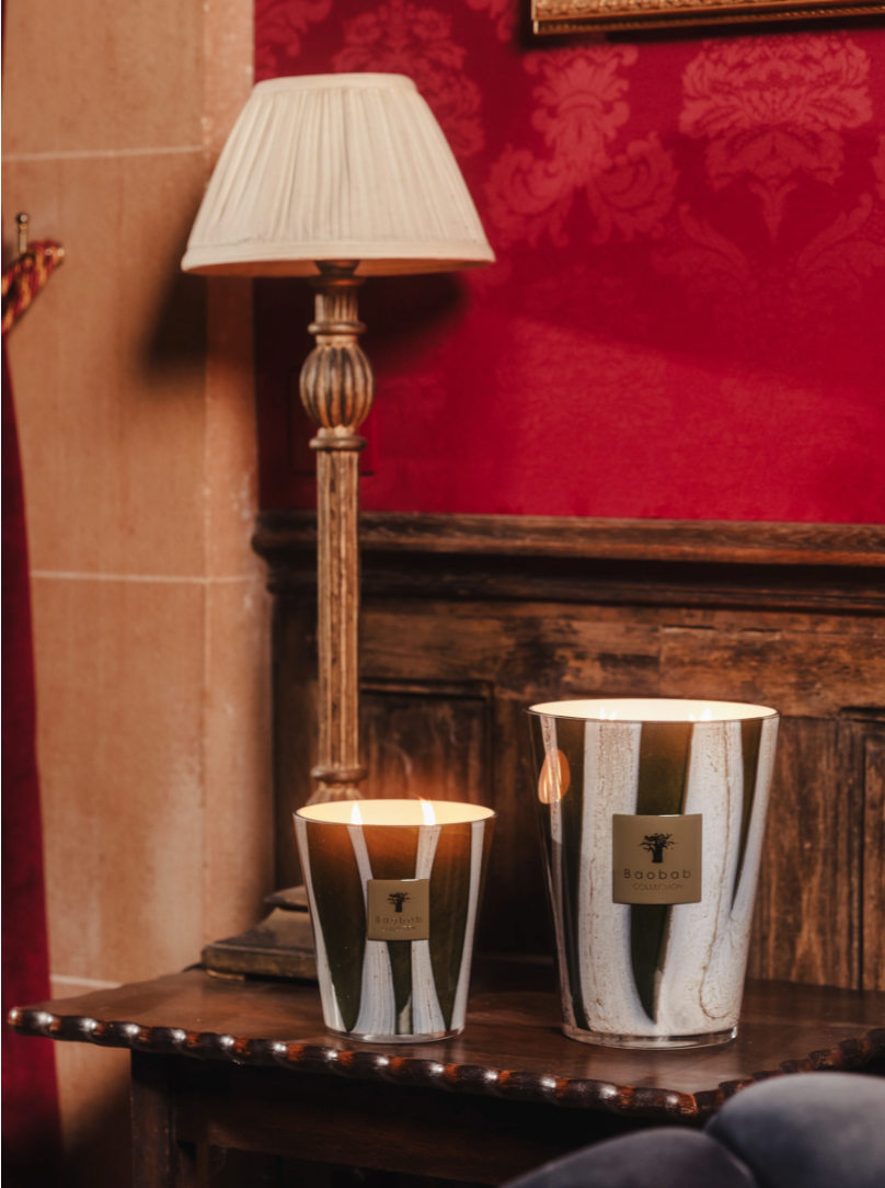 The glass of the Sherwood scented candle is punctuated with vertical lines resembling majestic trunks reaching for the sky. Deep green, with khaki highlights that sometimes fade into browns or yellows, the candle comes alive with bewitching reflections.