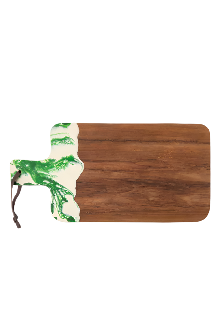 Teak and resin are handcrafted together, bringing a splash of color to any setting. These two-toned serving boards are hand-dipped, making each one-of-a-kind. Available in a new color, Dark Green Swirled!