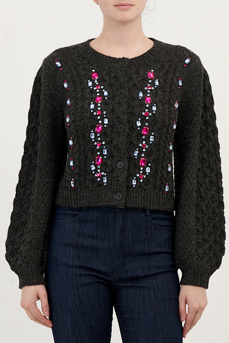 Cinq à Sept - Joelle Embellished Cable Cardigan - Charcoal/Fuchsia