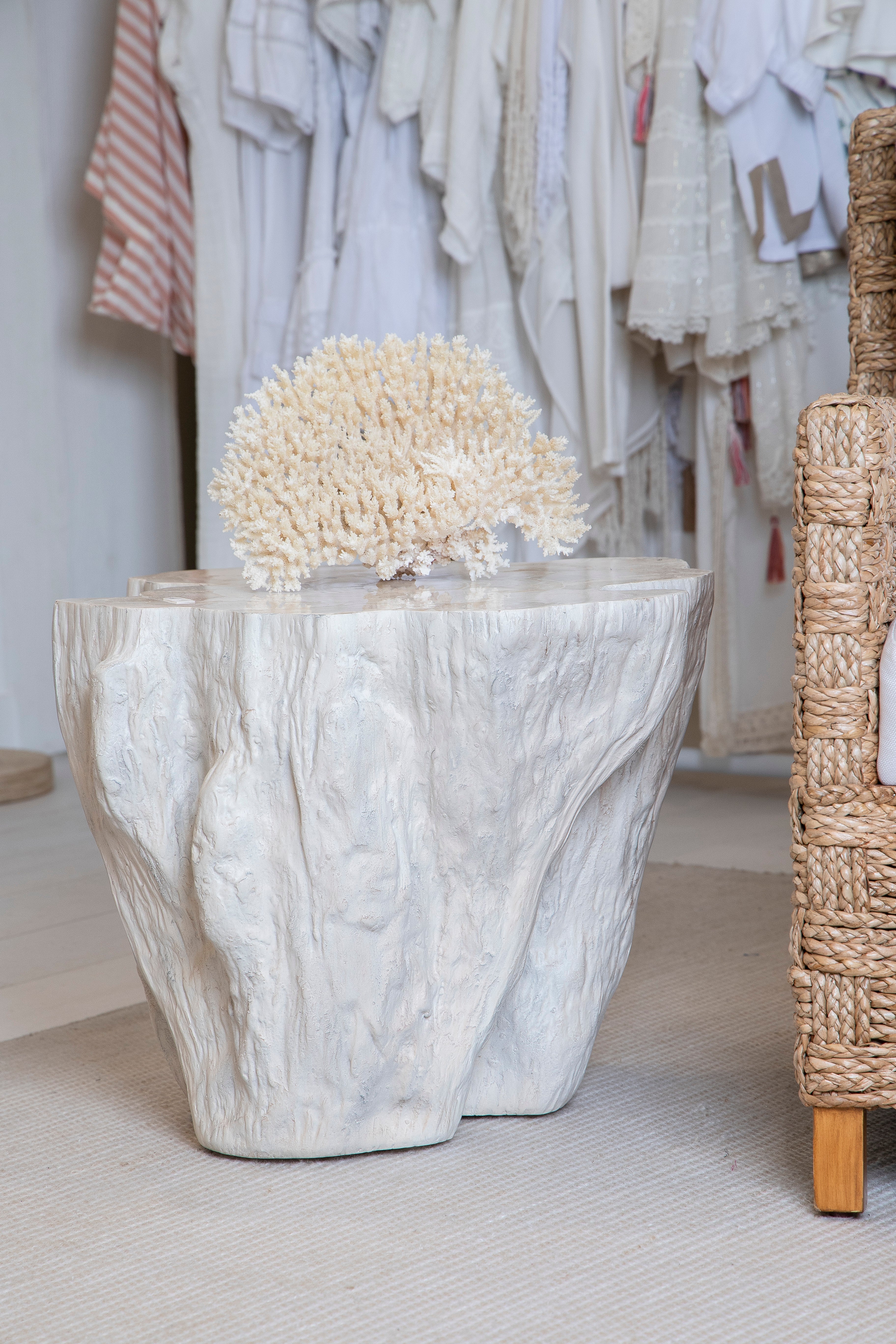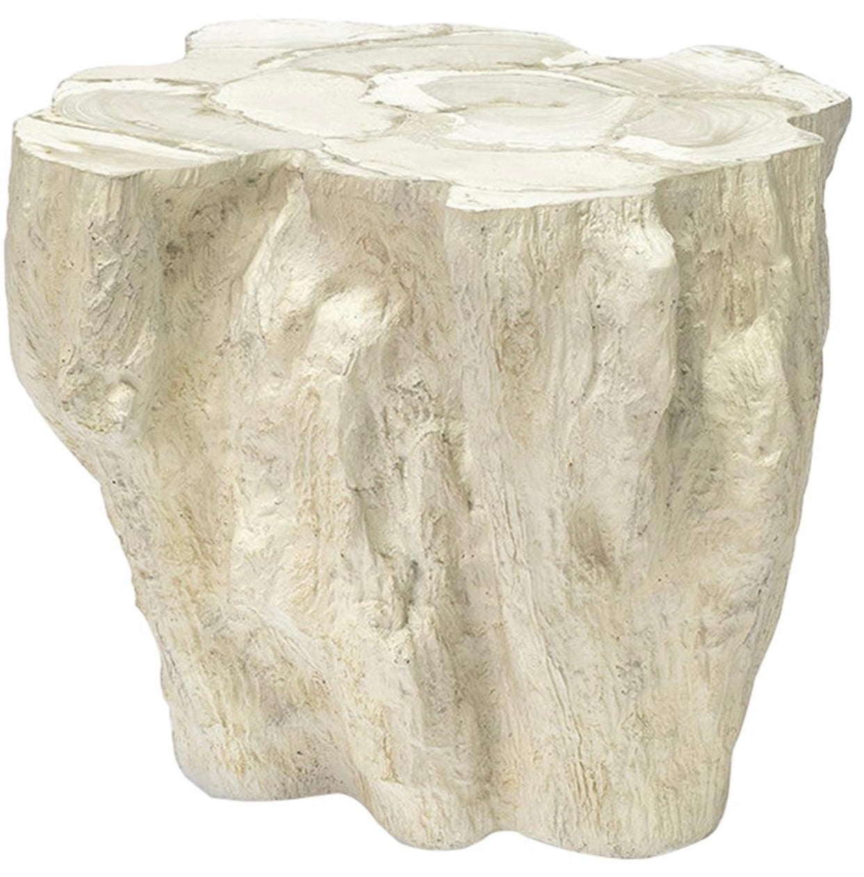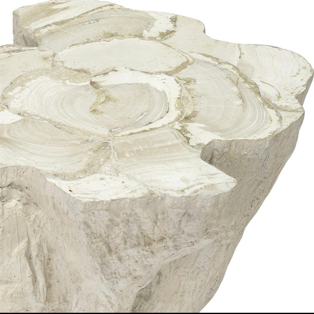 Inlaid fossilized clam shell on stonecast base made from a natural tree trunk mold finished in warm cream tones. Clam is a natural material and may slightly vary in color and grain.
