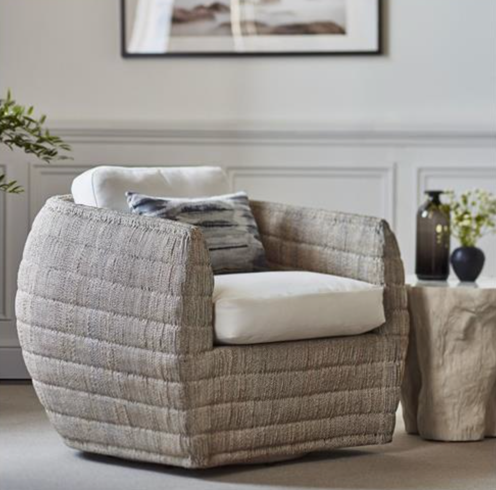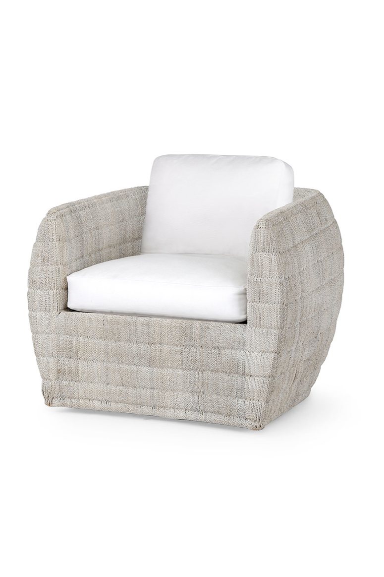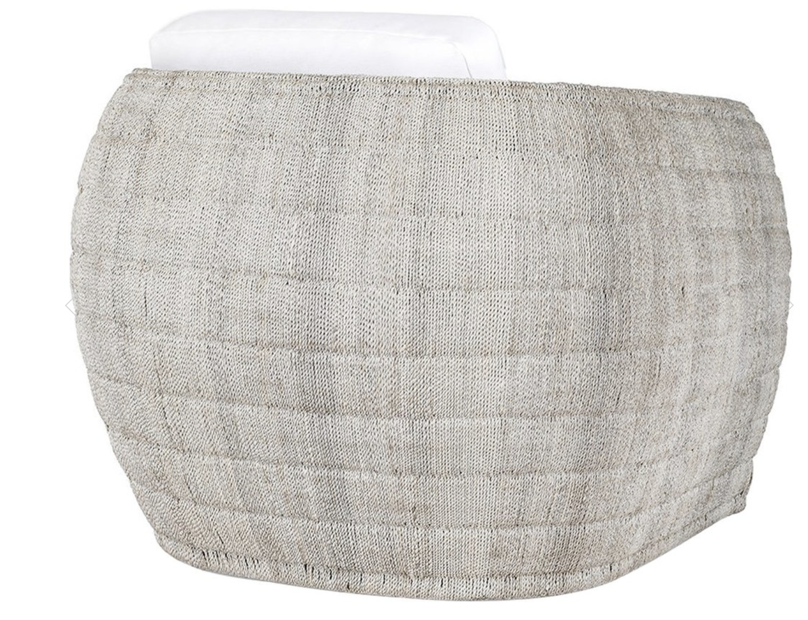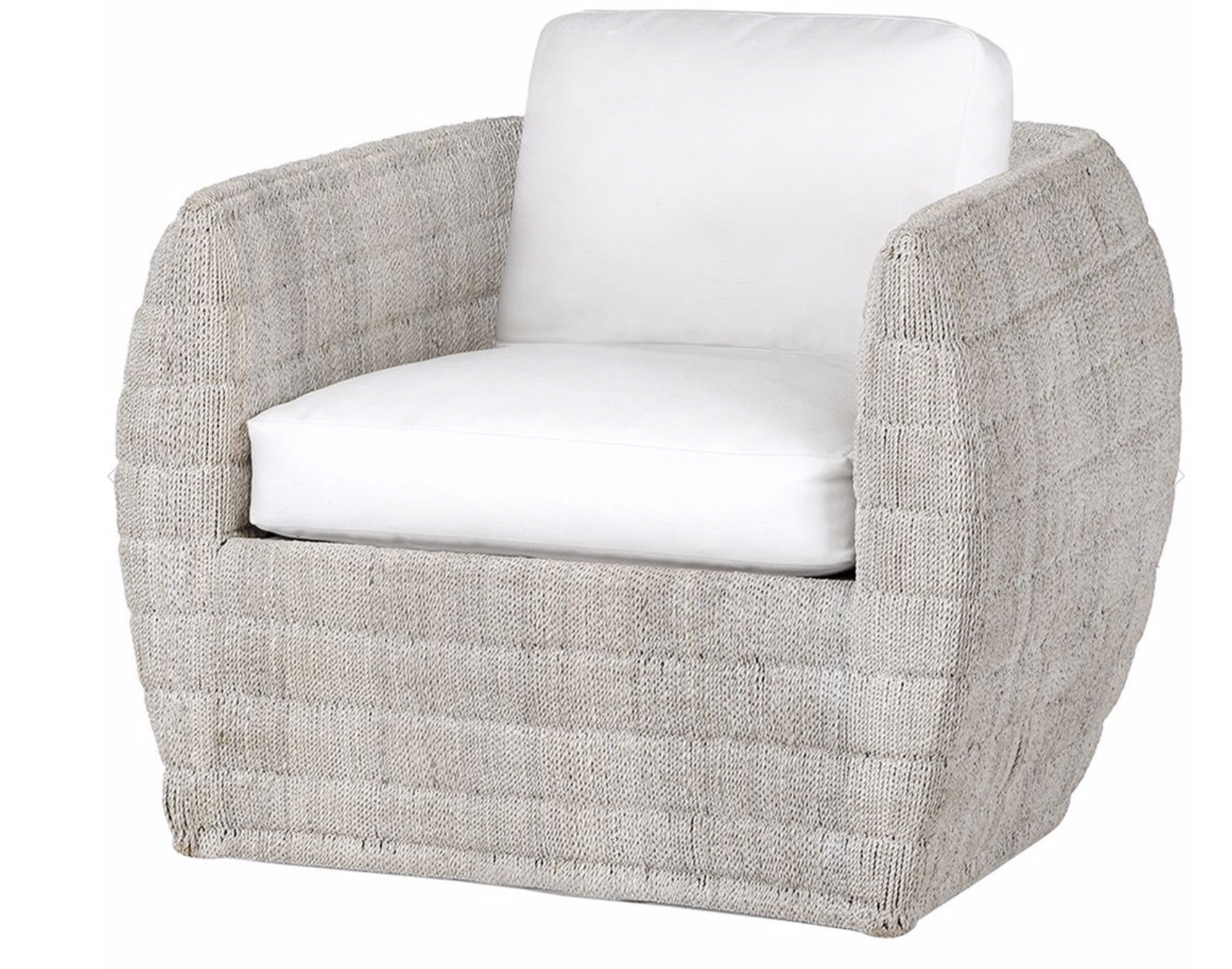 This is a crowd favorite from beauty to comfort. Metal swivel base hardwood frame with double wall back, sides and apron in hand-wrapped lampakanai rope in a white-wash finish. Lounge chair features a 360 degree swivel mechanism and comes with loose seat and back cushions.