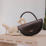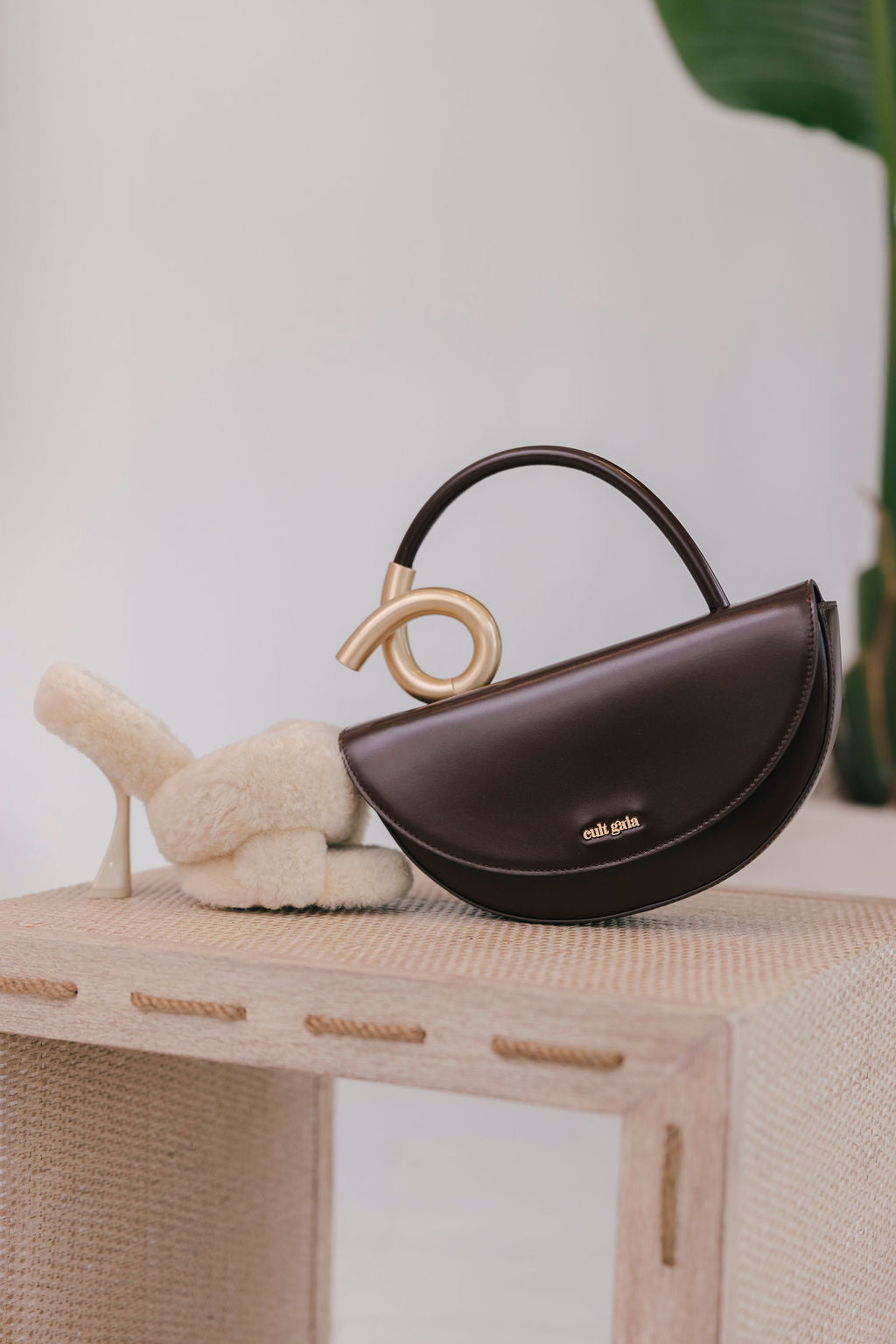 The top-handle silhouette is designed in a half moon shape and detailed with sculptural brass hardware that coils at the handle.