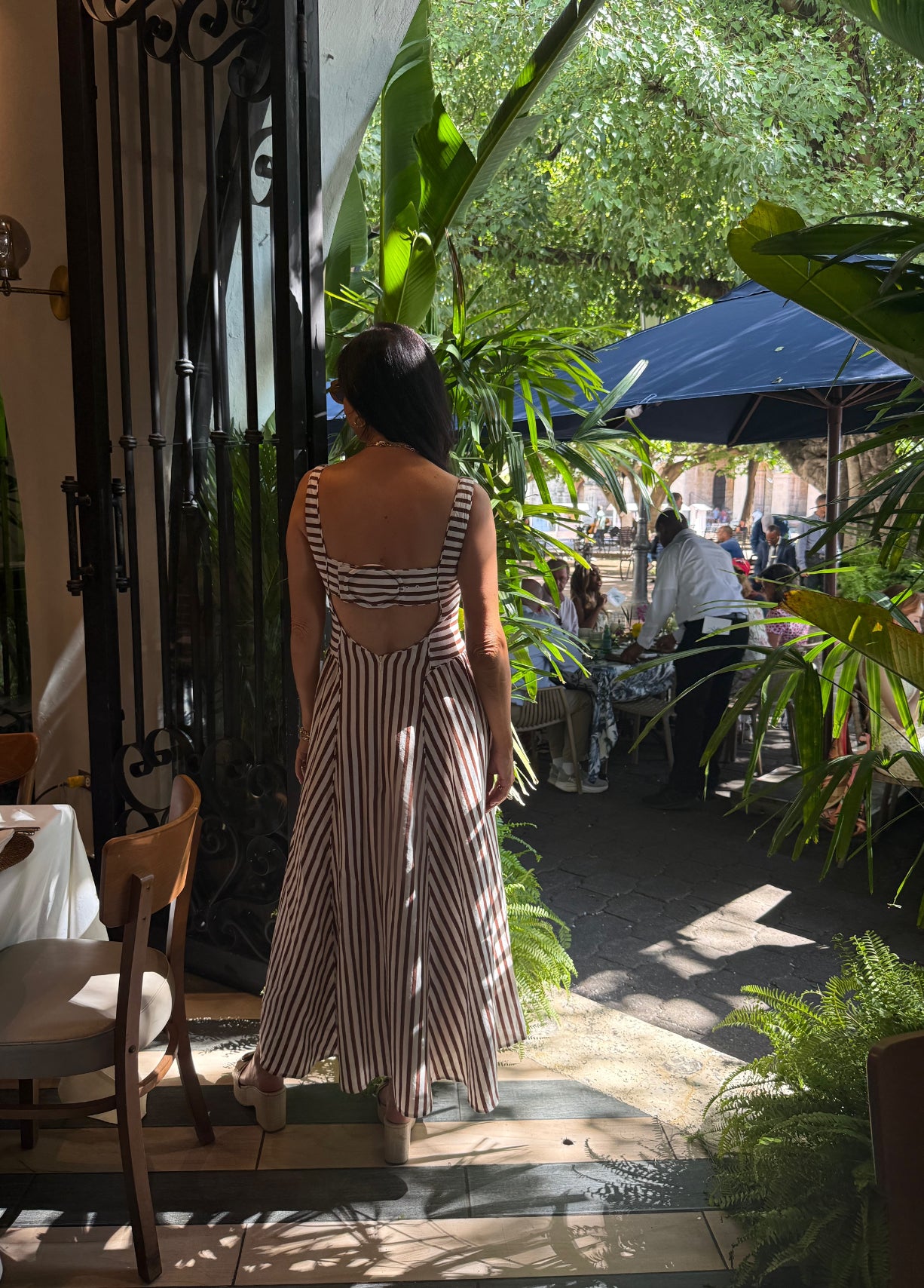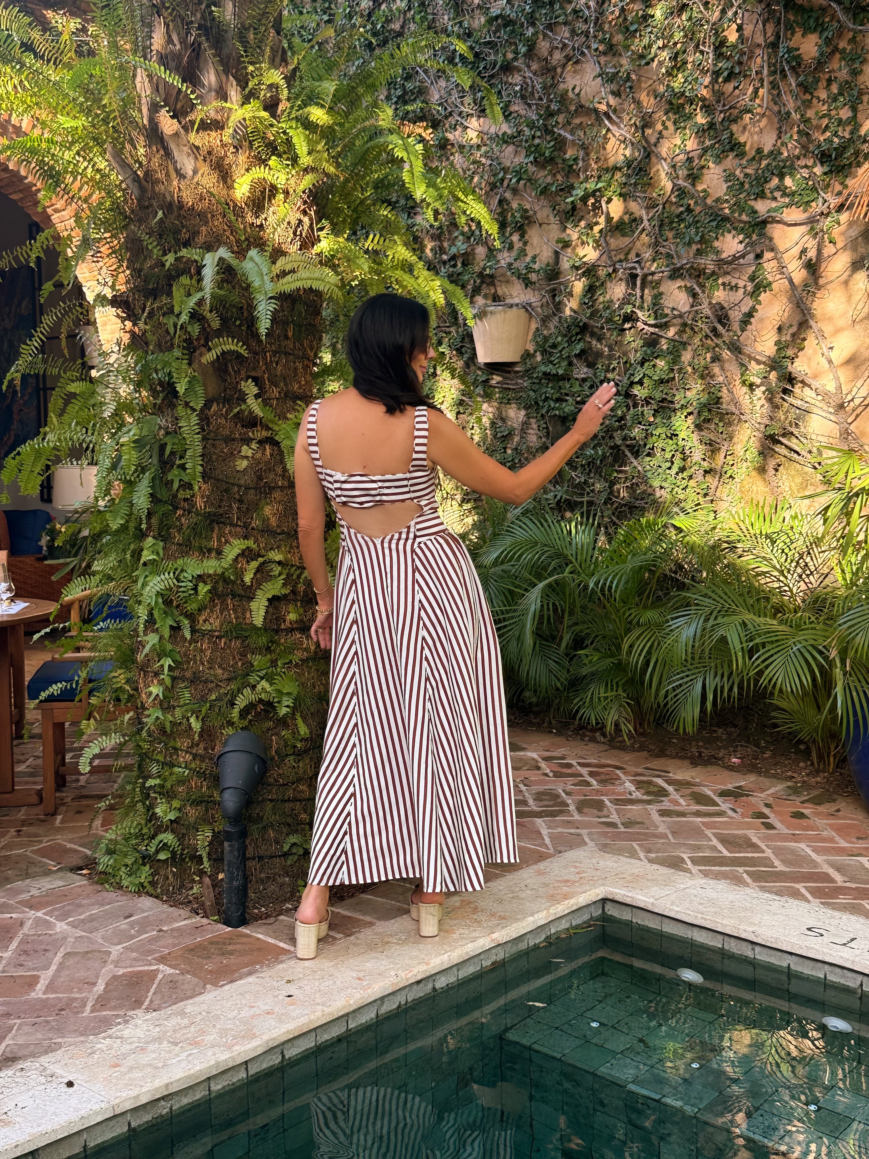 A linen blend midi dress with a square neckline, fitted bodice, and an open back finished with a jumbo buckle and corded piping along the seams.