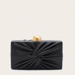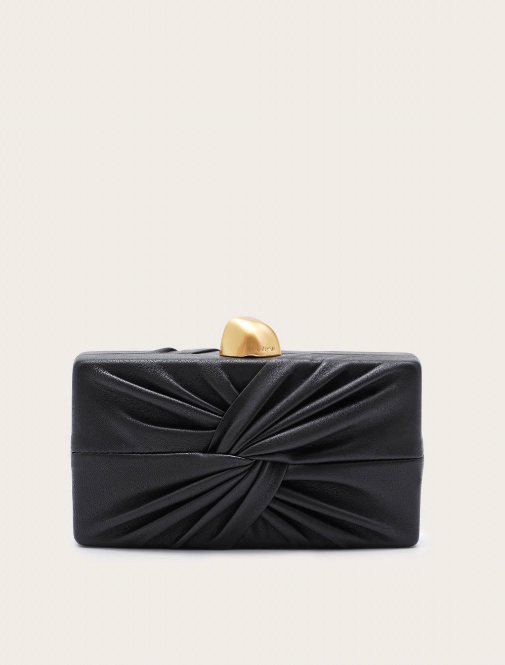 An sophisticated clutch with an abstract gold top clasp and knotted leather detailing.
