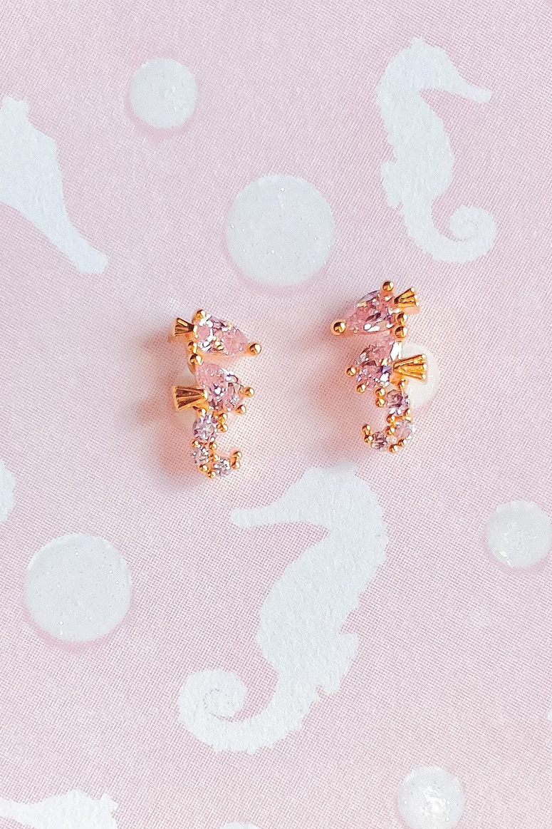 Seahorses like to swim in pairs attached to the tail. Isn't that so cute? Tell your friends this fun fact when you wear these Sparkling Seahorse Studs!
