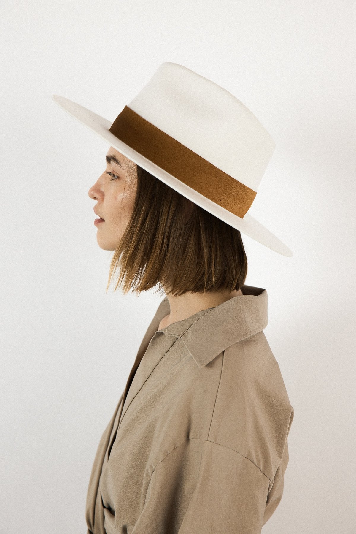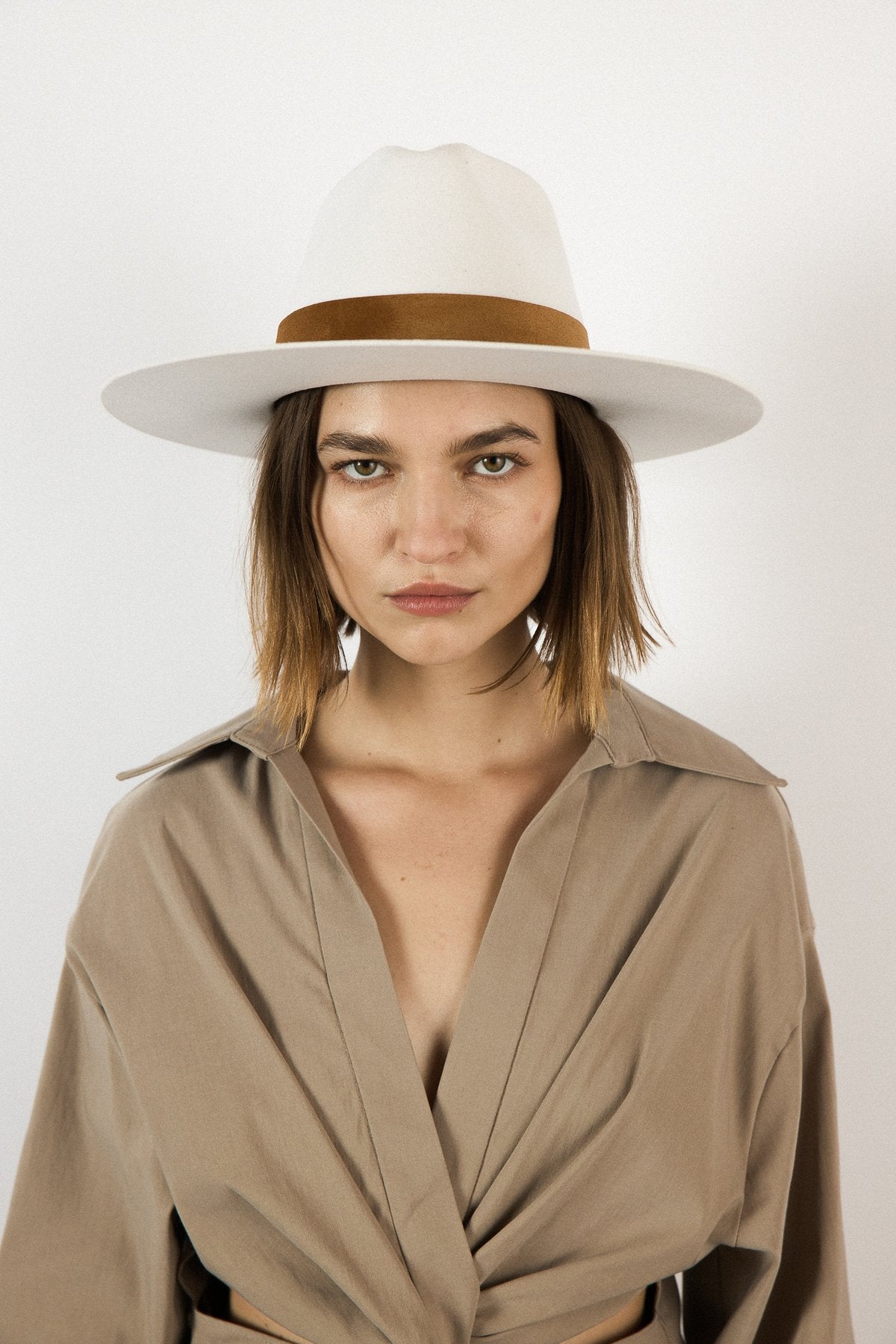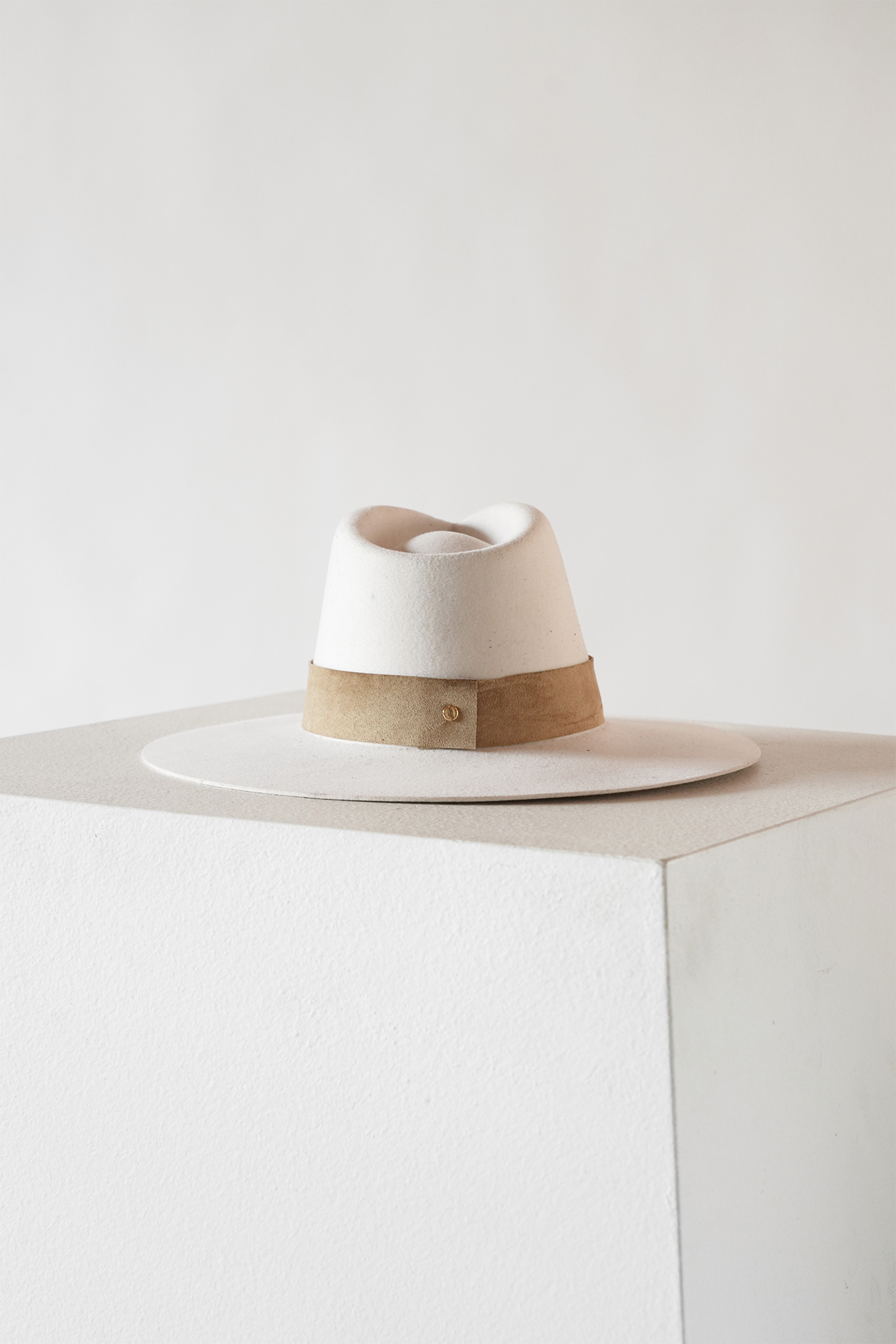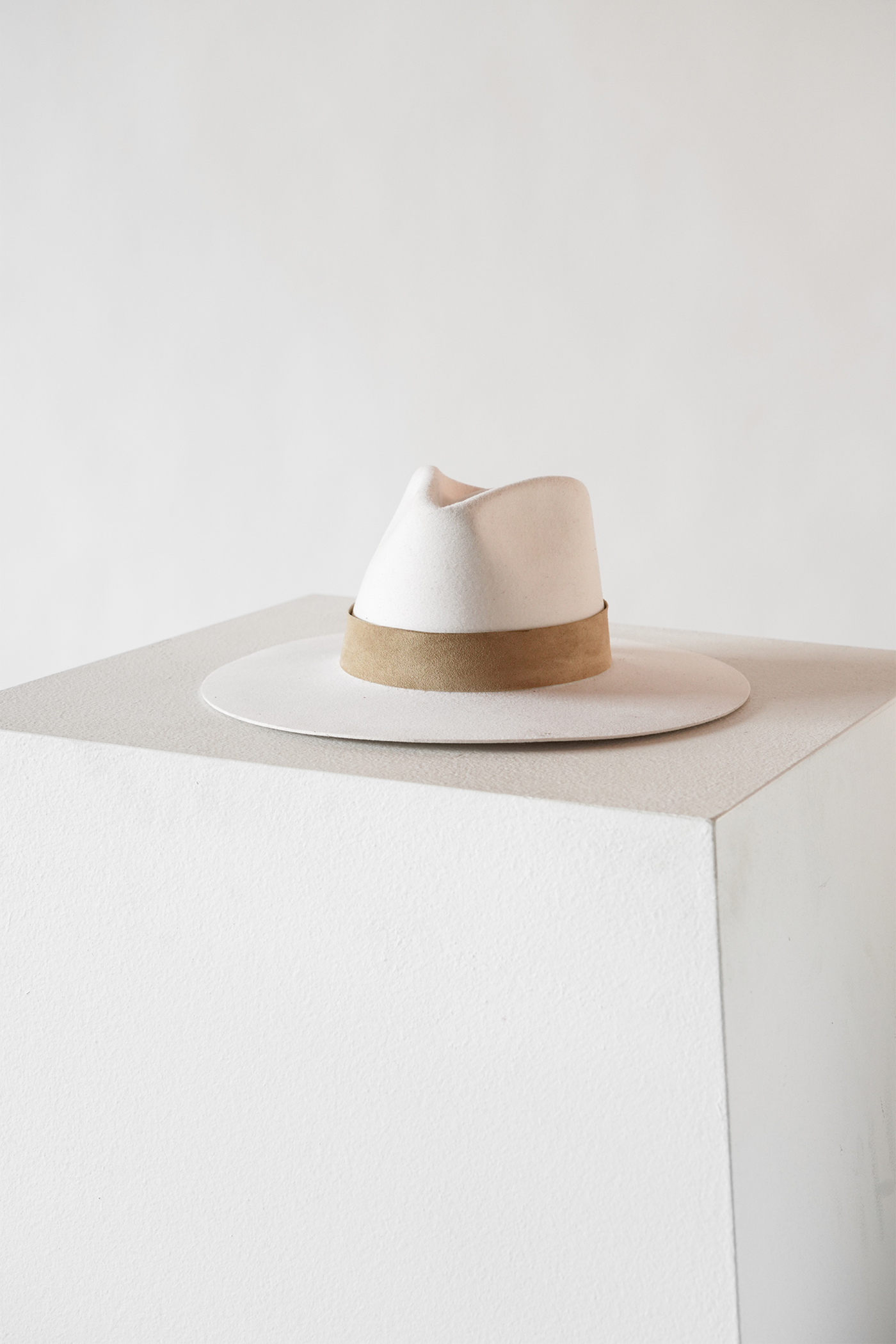 A structured hat designed with clean lines and a dramatic tall crown. Made in a versatile off-white shade and finished with a wide suede band. This hat is the perfect closet staple and was designed to make a statement.