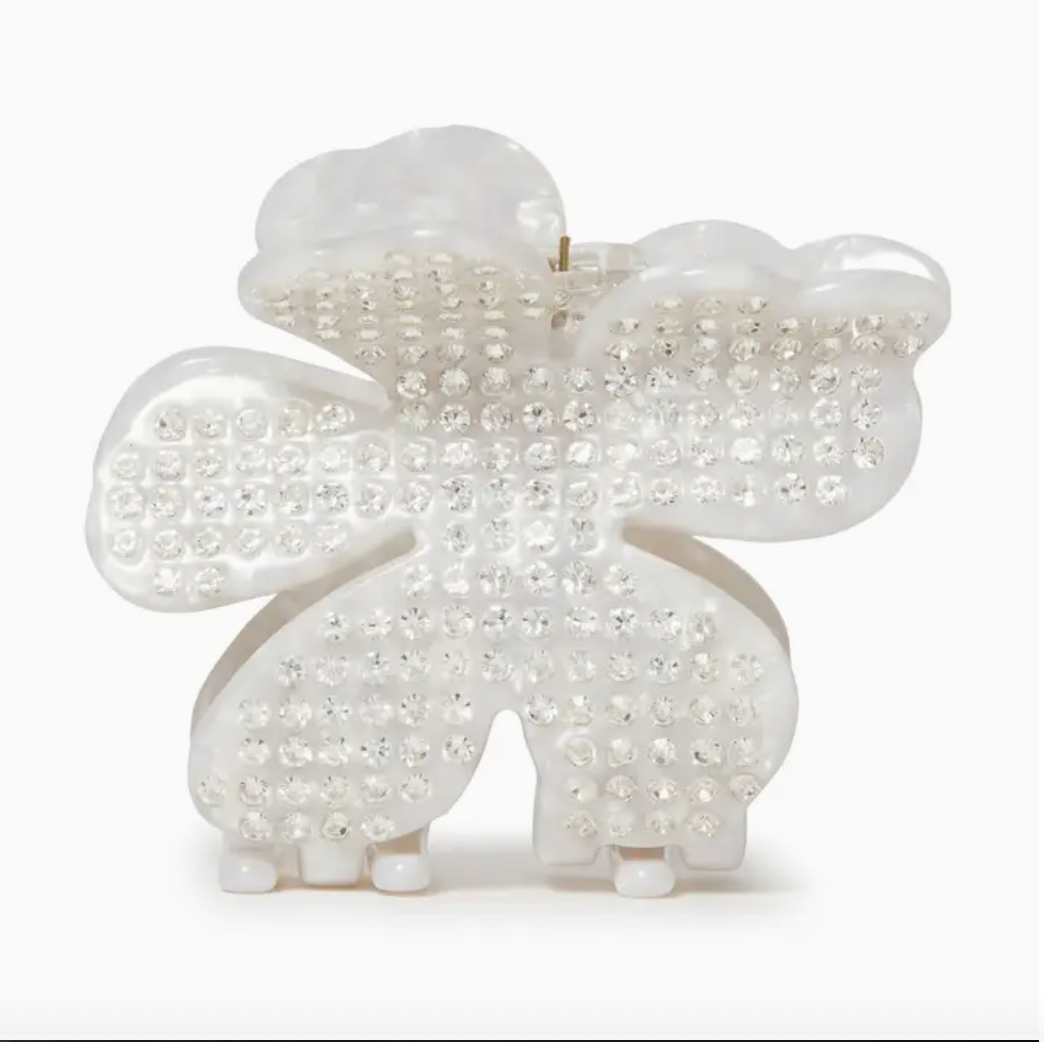 We have upgraded our bestselling Lily claw clip to a pave design. Use it to elevate the classic half-up hairstyle. ∙ Mother-of-pearl acetate claw clip ∙ Covered in hand-set pave crystals ∙ Measures 2" by 1" width ∙ Trademark logo charm ∙ Spot clean, store in resealable striped plastic pouch