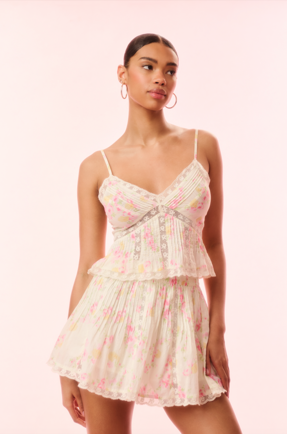 Introducing the Amrina Skirt. Designed on a lightweight cotton voile fabric, this mini features a bright Italian countryside-inspired floral all over. The Victorian-inspired skirt has an A-line silhouette, flirty lace details, and smocking at the waist for easy pull on. Pair with the Elsette Top for a full set.
