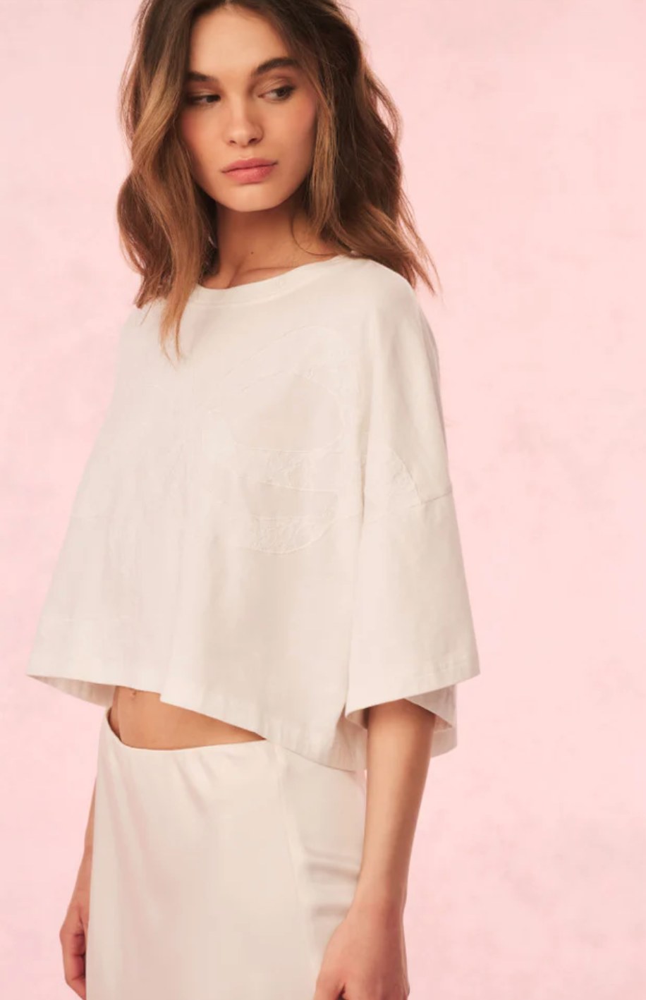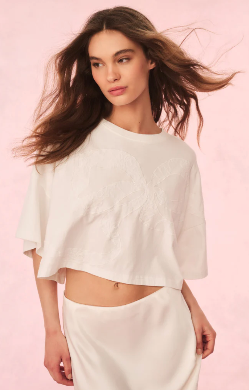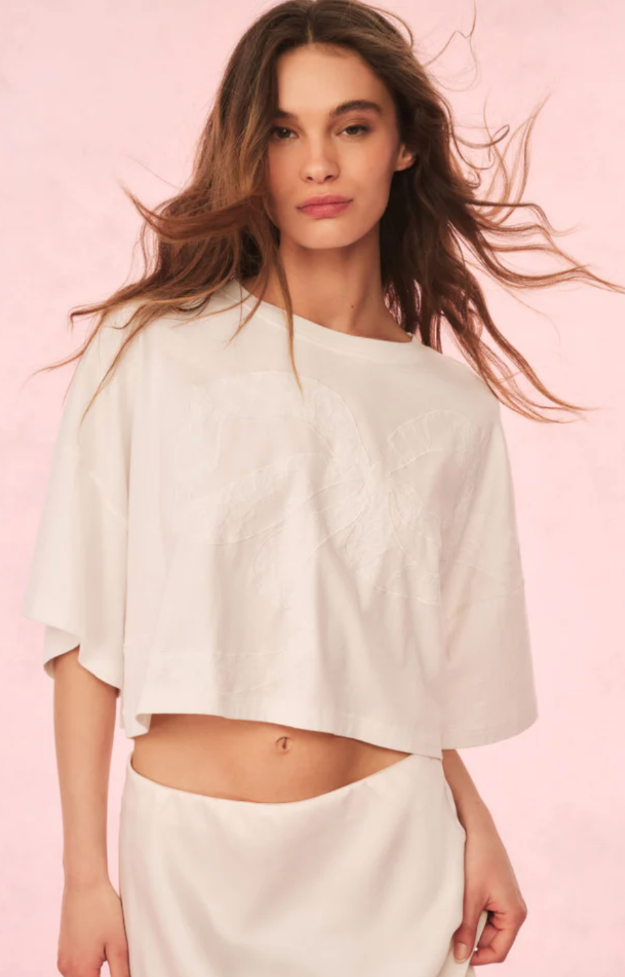 Easy breezy in the Angelle Tee. A new timeless staple, this classic tee arrives in 100% cotton with a winding bow across the body designed as a sheer, lace inset for intricate detail. The top has a drop shoulder, nice roomy sleeves, an oversized body, and a slightly cropped hem. Pair with a Ruffle Mini Skirt or your favorite vintage denim.