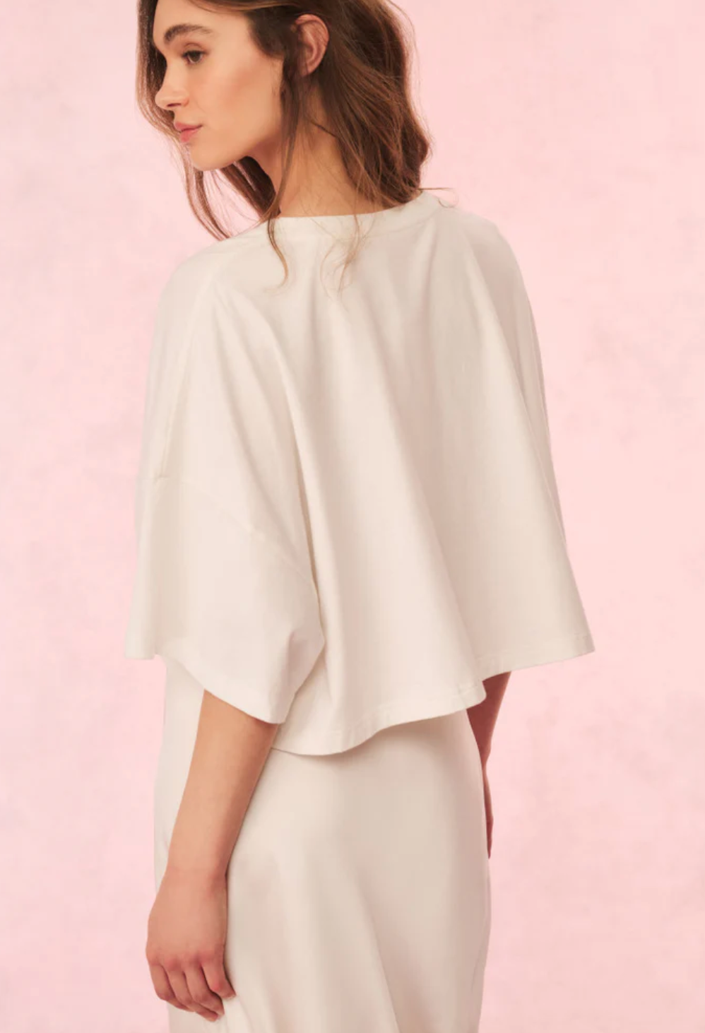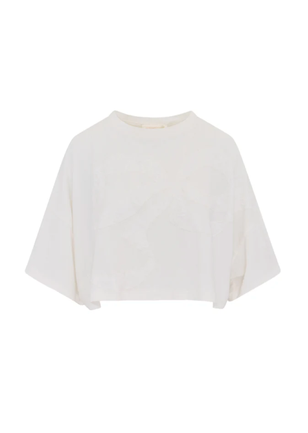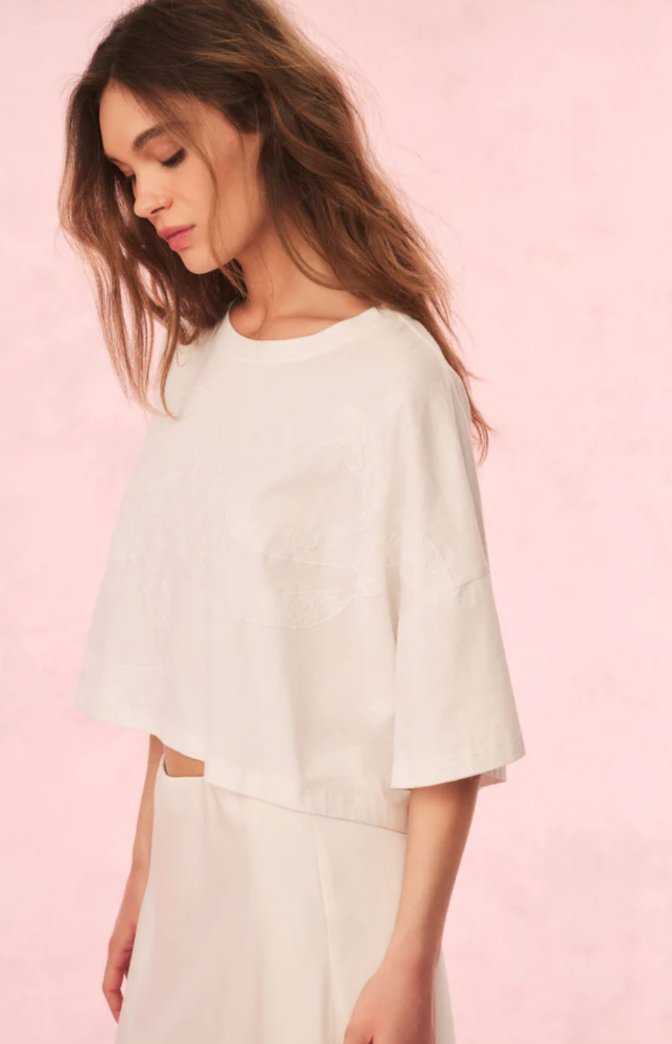 Easy breezy in the Angelle Tee. A new timeless staple, this classic tee arrives in 100% cotton with a winding bow across the body designed as a sheer, lace inset for intricate detail. The top has a drop shoulder, nice roomy sleeves, an oversized body, and a slightly cropped hem. Pair with a Ruffle Mini Skirt or your favorite vintage denim.