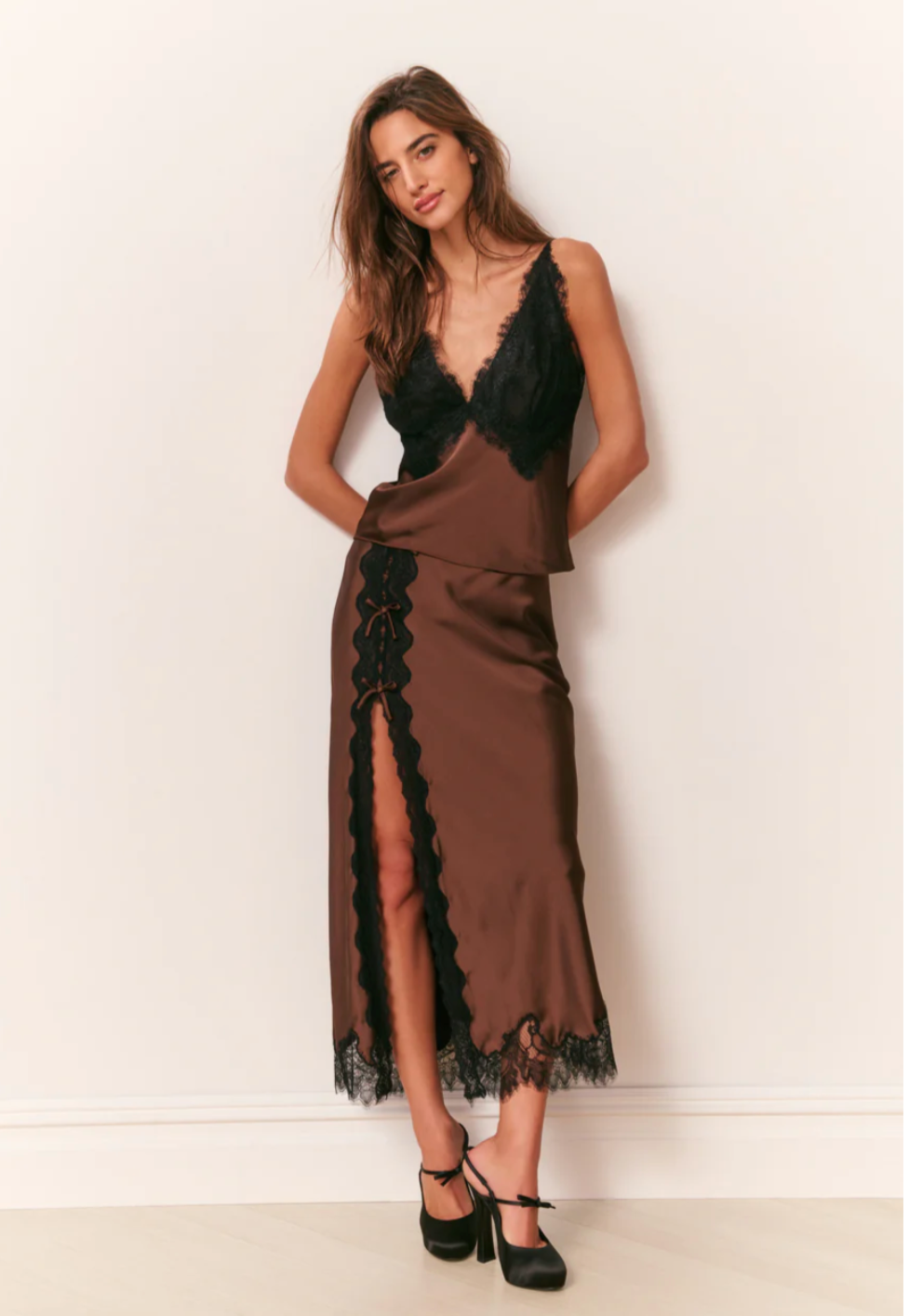 The Elloryn Top brings an easy elegance in satin charmeuse with a graceful drape. Cut on the bias for a flattering fit, this cami features a plunging V-neckline with delicate contrast lace appliqué at the bodice. Slim spaghetti straps and a back zipper complete this timeless piece, perfect for layering or wearing on its own. Pair with the Calder Skirt for a full set.