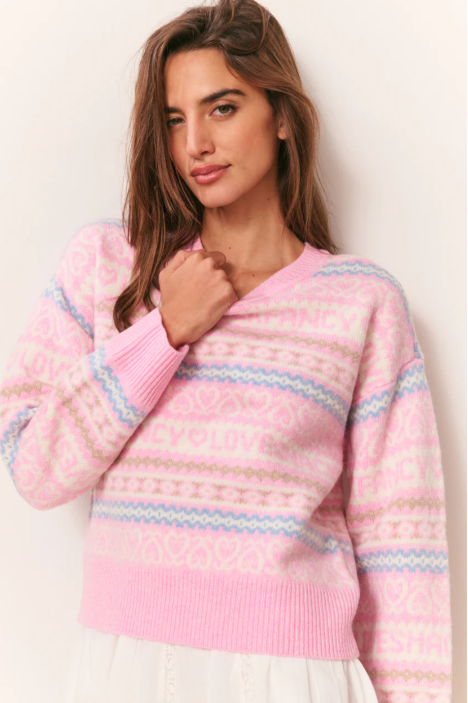 The Emberly Pullover is a cozy, playful knit crafted from 100% extra-fine merino wool. Designed with a slightly relaxed fit, it features custom LoveShackFancy stitching throughout, including whimsical hearts and “Loveshackfancy” lettering. Ribbed trims at the cuffs, hem, and neckline add structure, making this pullover an effortlessly cute and classic addition to your cold-weather wardrobe.