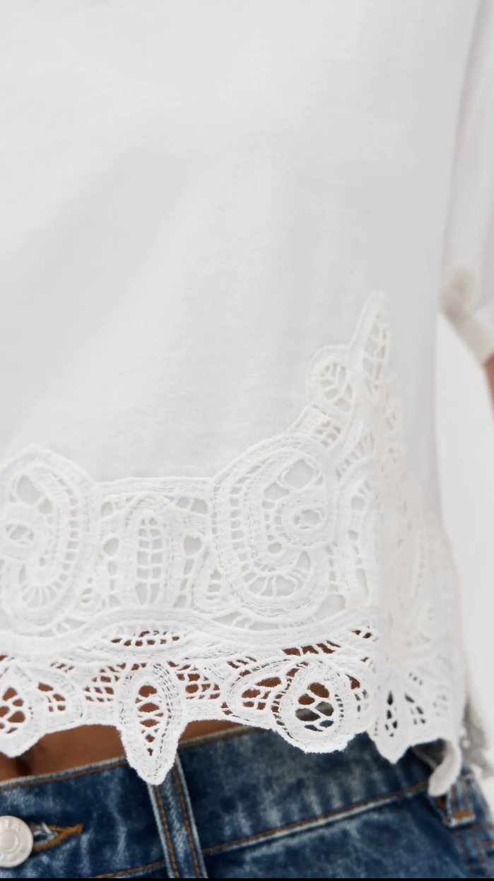 This Karolin Tee by LoveShackFancy is crafted from lightweight stretch jersey. It features a lace hem, crew neck, and short sleeves. It has a length of 18.5in / 47.0cm, from shoulder and is made of 100% cotton.