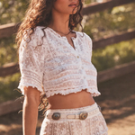 The Nerissa Blouse captures vintage-inspired charm with a delicate floral eyelet pattern woven into lightweight cotton. This silhouette features a crew neckline and half-length sleeves. Scalloped edges at the neckline, cuffs, and hem provide an intricate, feminine finish.