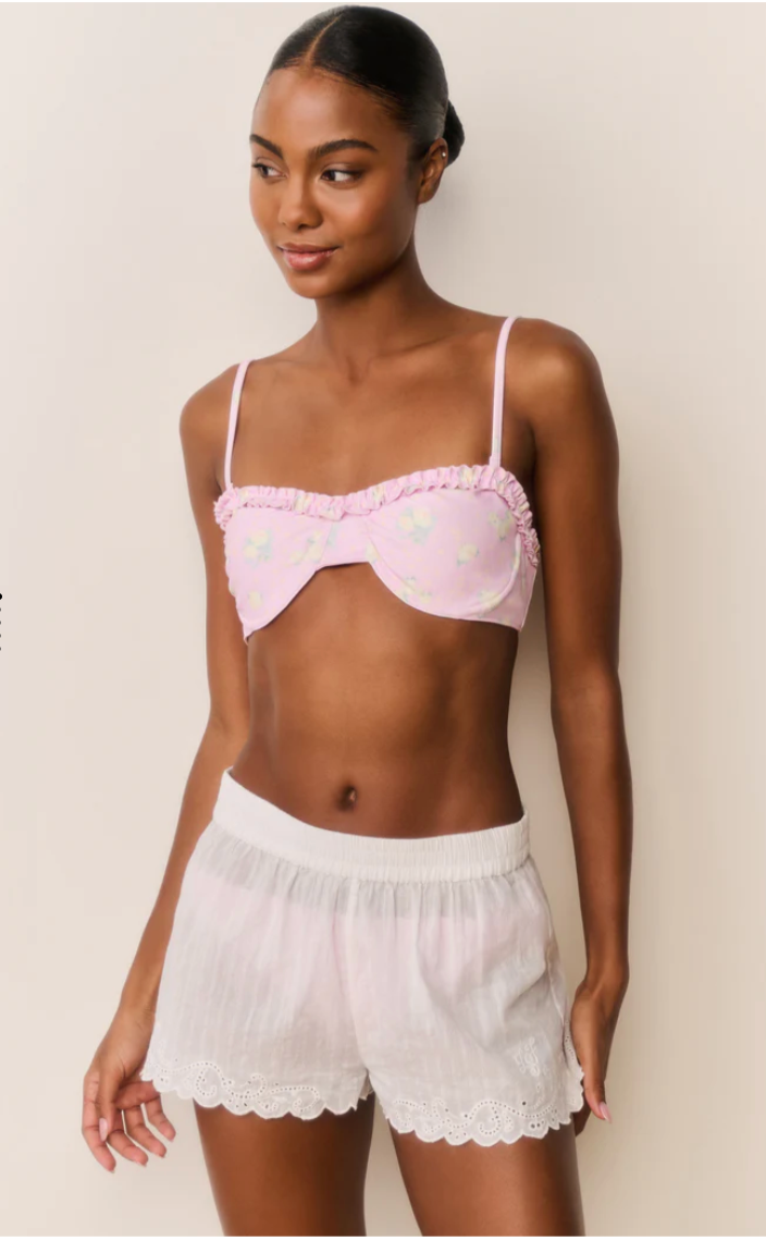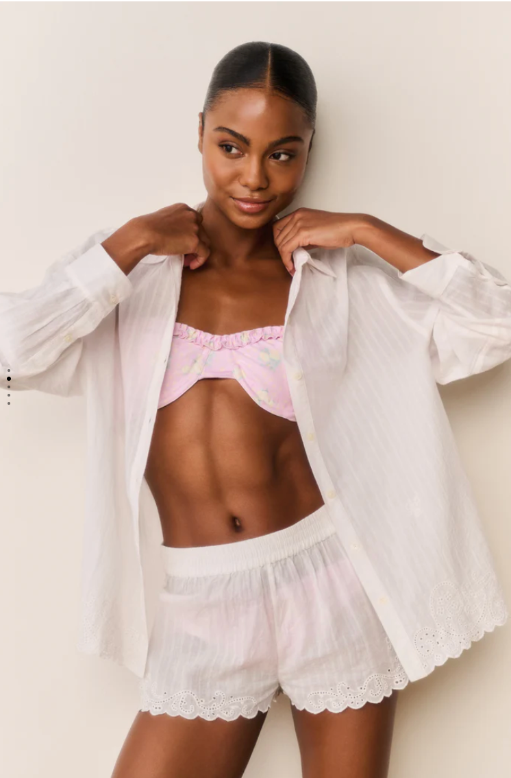 The Ocean Shorts blend relaxed ease with thoughtful feminine detail. Crafted from 100% cotton in a subtle stripe patterning, this mid-rise silhouette is perfect for all-day comfort. Delicate embroidery accents the legs, while scalloped trim along the hem creates a gentle, flattering curve. Breezy and effortless, they’re perfect for warm days by the water.