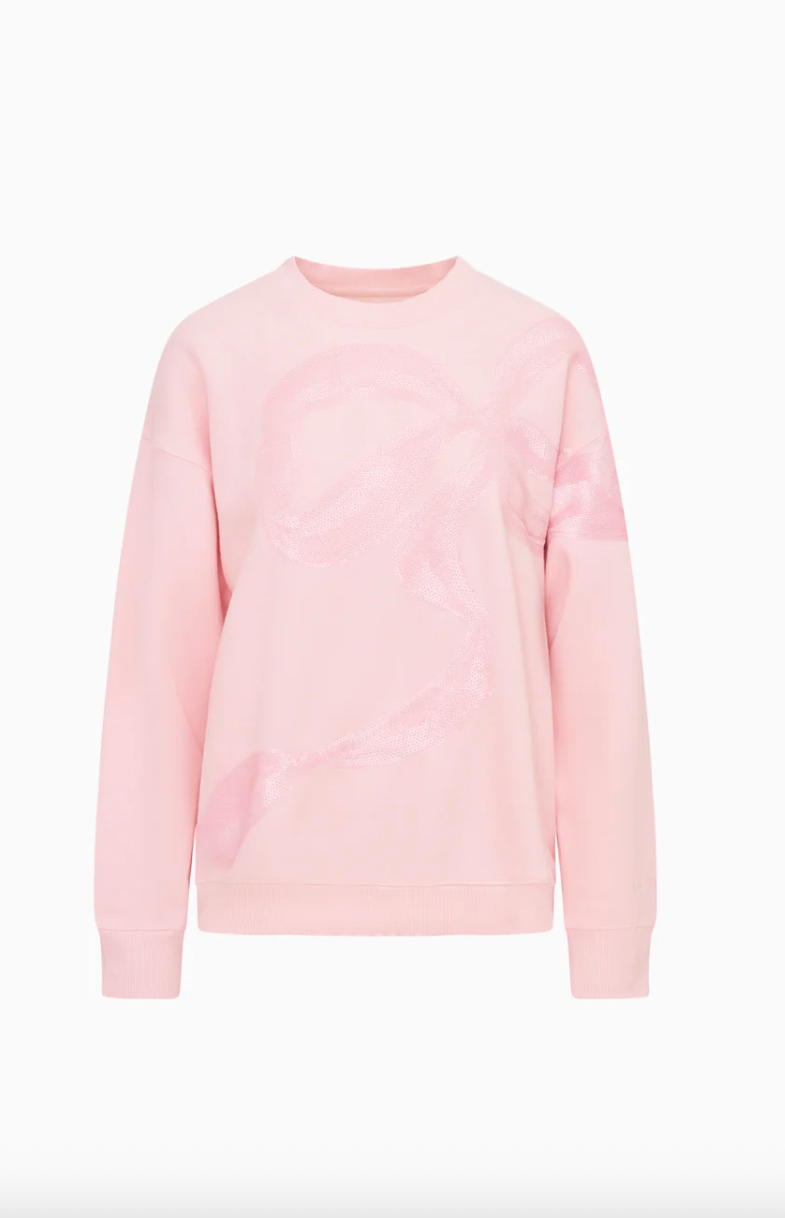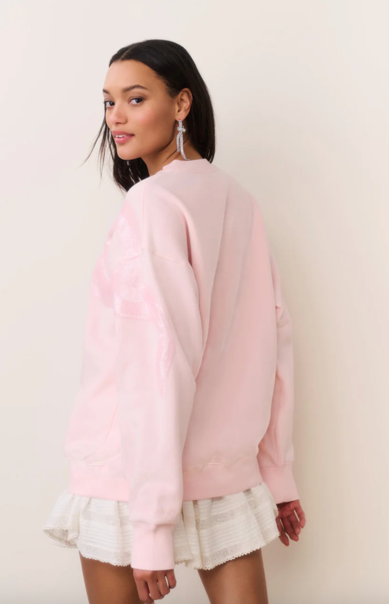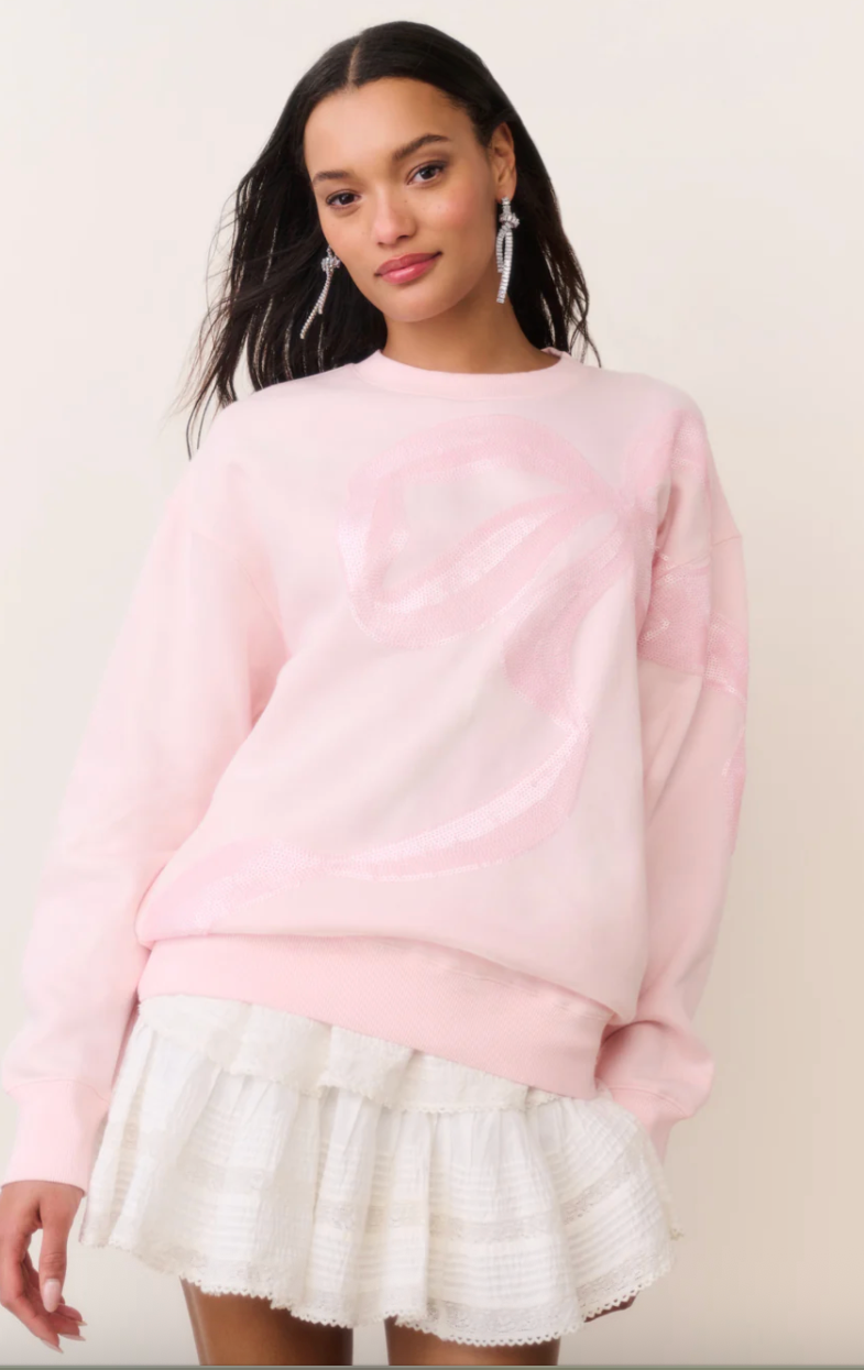 Our best-selling Palo Pullover returns for the holiday season, now shimmering with matte, tone-on-tone sequins. This oversized sweatshirt features a large-scale winding bow motif in soft, wistful pink across the front. Ribbed trims at the neckline, cuffs, and hem give structure to the cozy silhouette, while the sequin detail adds playful dimension. A sparklingly fun layer that turns casual comfort into festive chic.