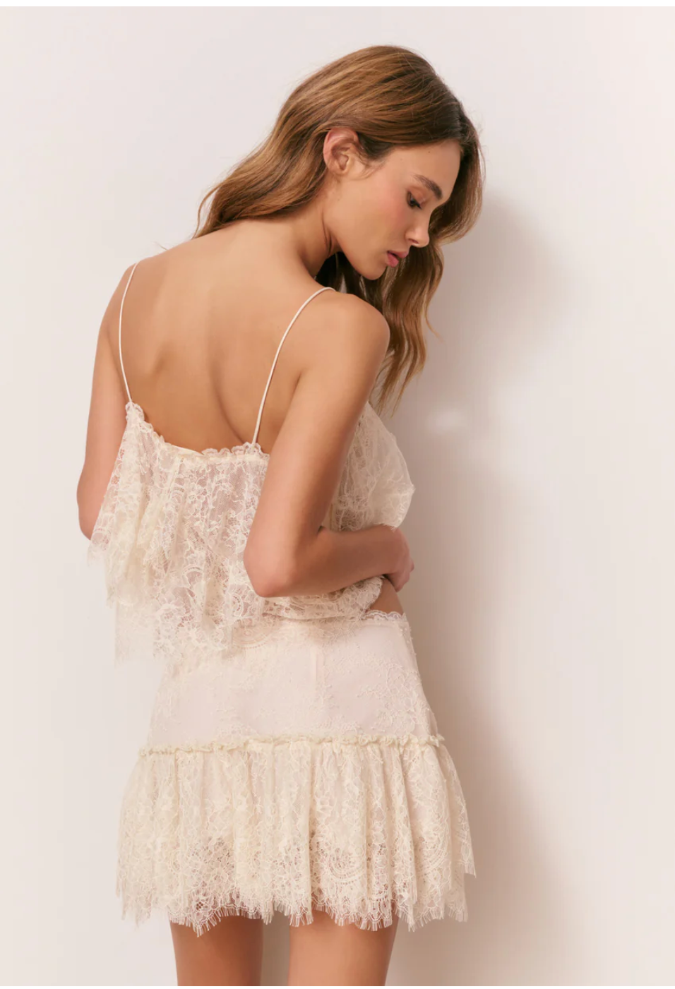 Our Reika Skirt twirls onto the scene in delicate Chantilly lace romantic charm. This Bohemian-inspired mini sits with a fitted yoke before releasing into asymmetrical ruffles that cascade into a dreamy, sweepy flounce. Fully lined in soft crepe for effortless wear, this playful yet feminine piece is made for dancing, wandering, and falling in love with every moment.