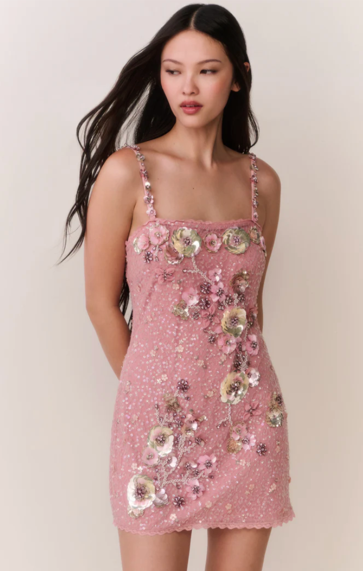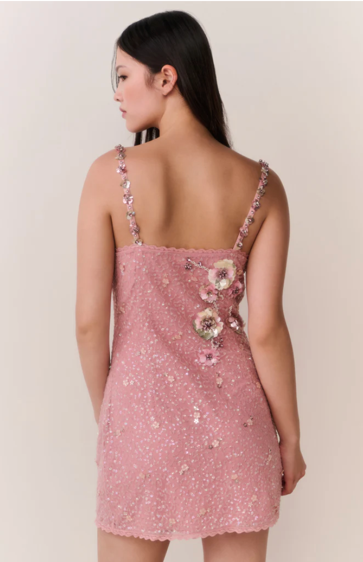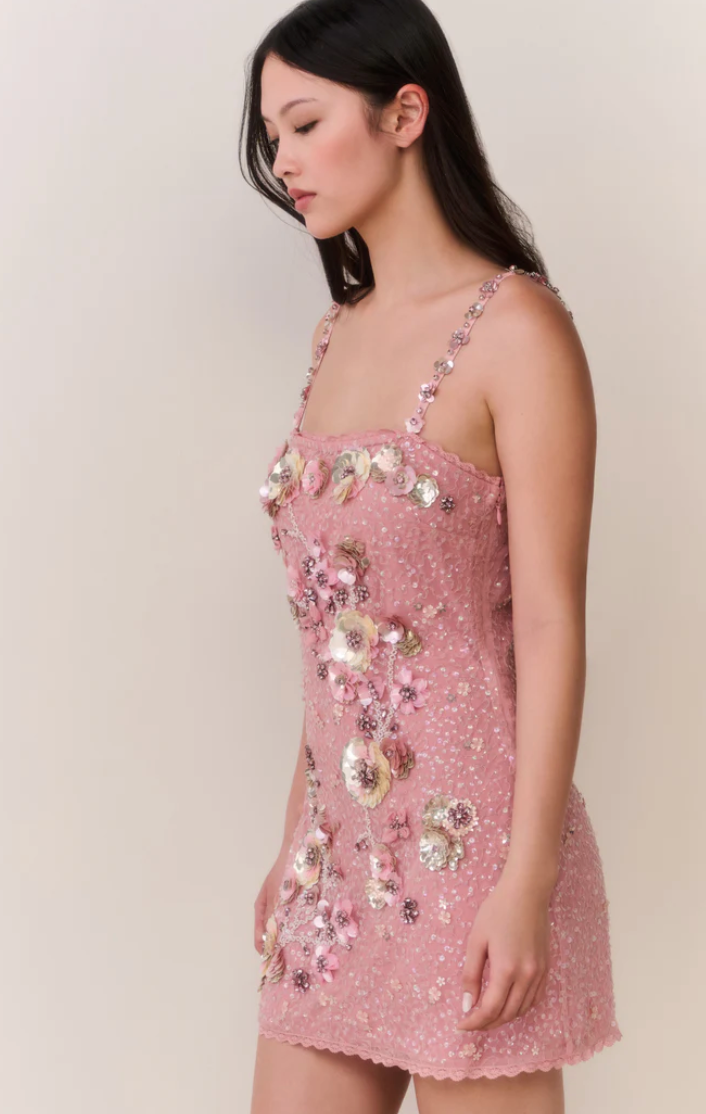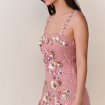 The Rosmara Dress is adorned with intricate 3D floral appliqués and shimmering sequin embellishments. This mini dress features a square neckline and floral-detailed straps, offering a lush, garden-inspired texture in a romantic cherry blossom palette.