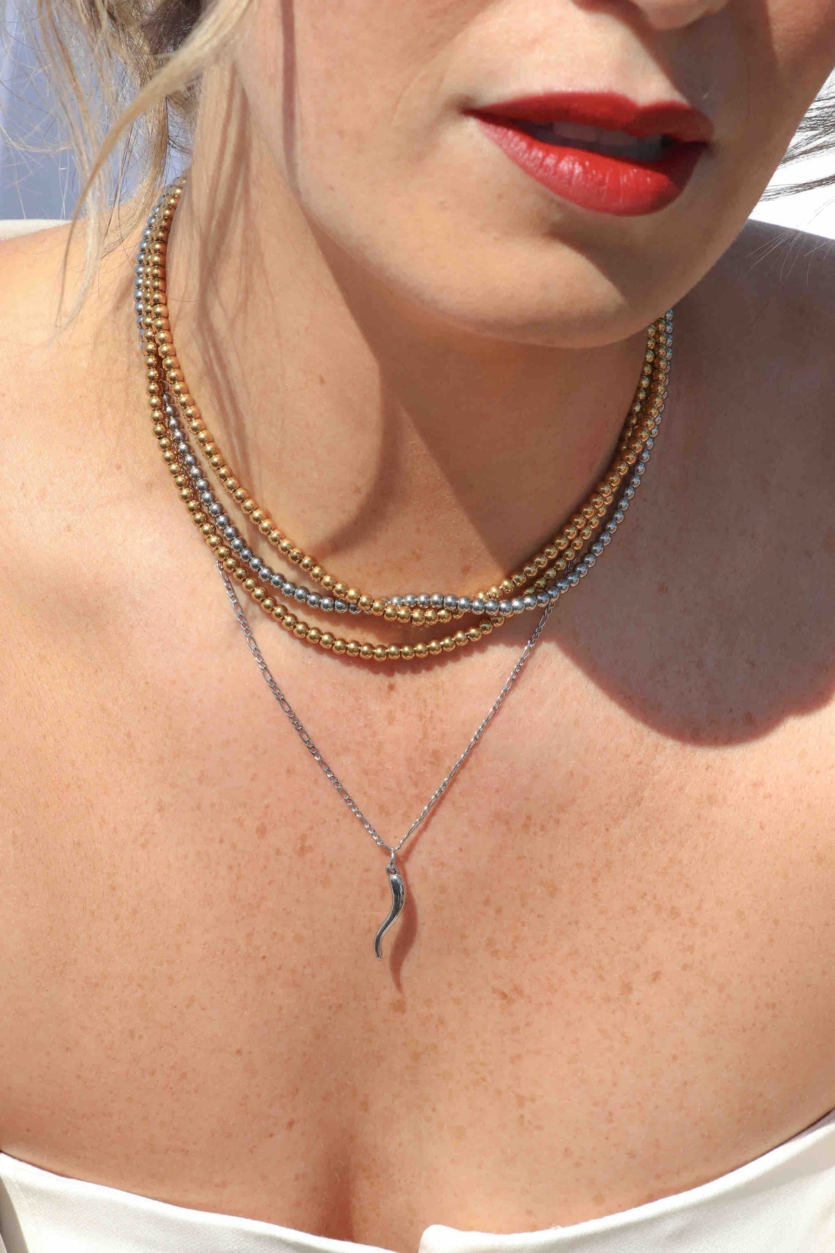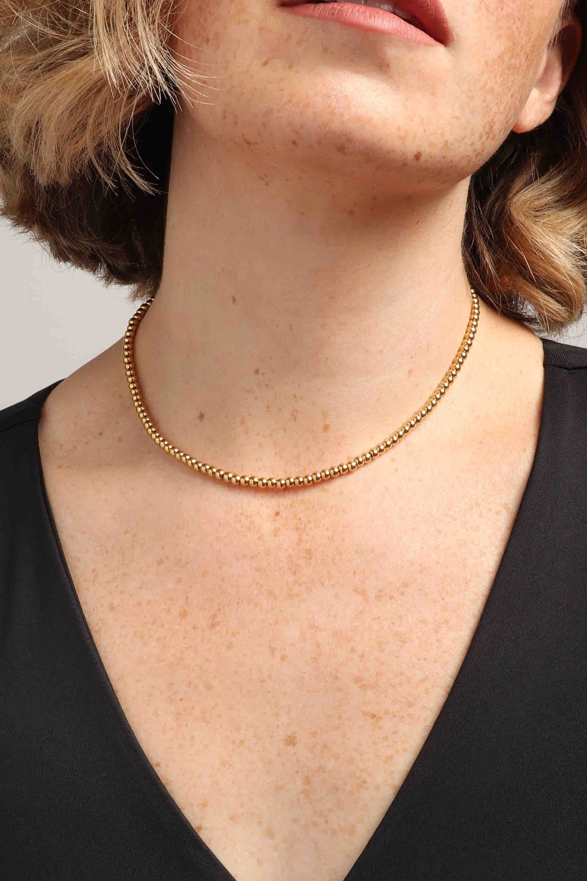 As the newest addition to the Crown Collection, the Crown Choker will make you feel like royalty. A layer-friendly must-have featuring 12” of 4mm highly polished beads strung on delicate round link chain, this piece also comes with a built-in extender, making it one of the most versatile pieces you will have in your jewelry collection. Gorgeous on its own, and perfect for layering, the Crown Choker adds just the right amount of sophistication to any necklace stack. Designer Tip: pair this piece with the removable charm from the Mills Pendant for a vintage-inspired trendy look that is sure to turn heads!