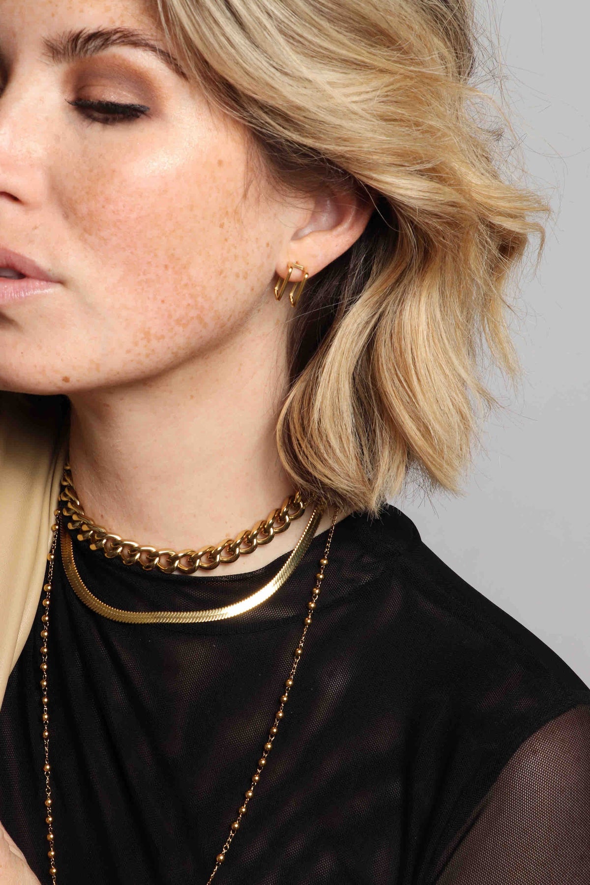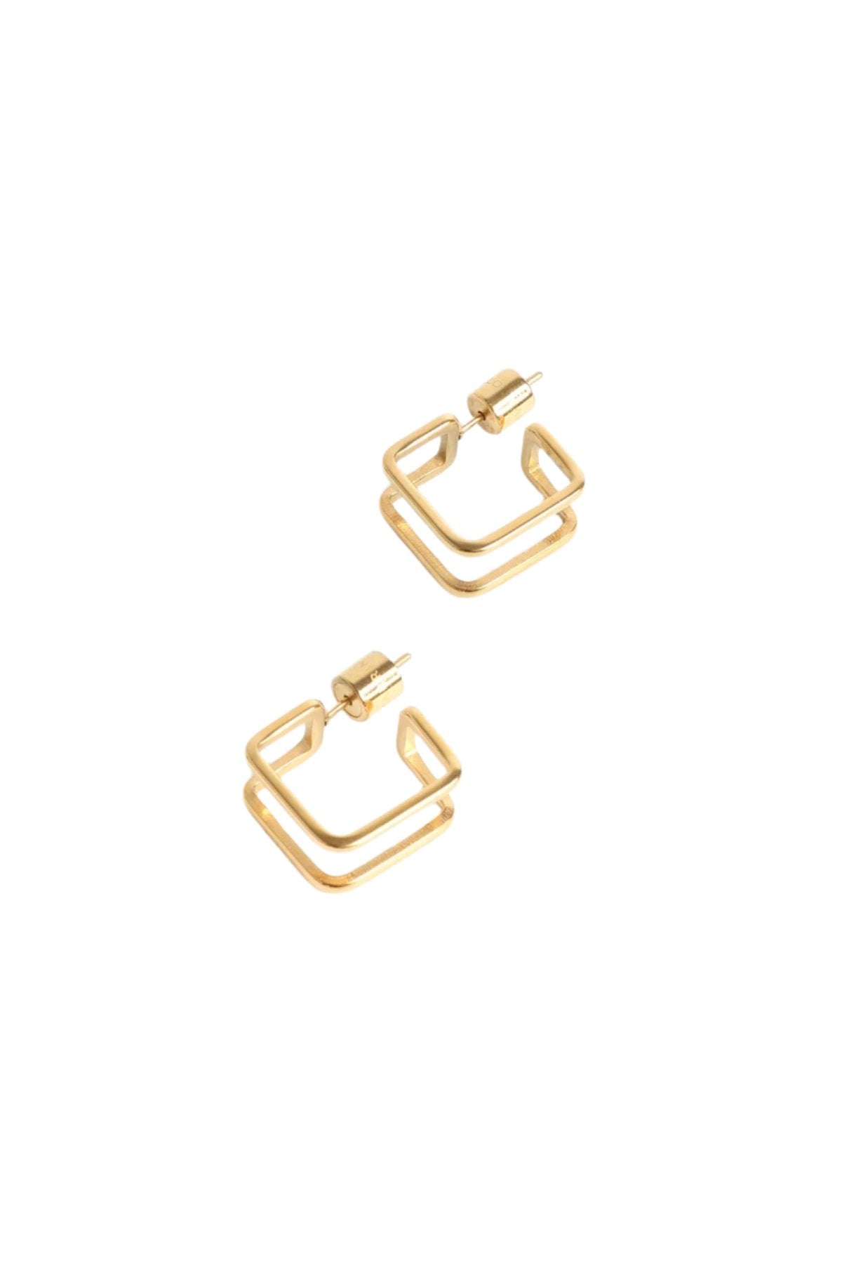 A subtle conversation starter that is sure to receive double-takes, our best-selling Stevie Hoop is a funky hoop that you will never tire of. Featuring a stainless steel base, this geometric style is designed to gain compliments from all angles — and is hypoallergenic and water-resistant. A three-dimensional open square concept poses as a double piercing earring, with just one singular post closure. Complimented with our custom cylinder earring backings — this lightweight earring is a fabulous design to take you from day to night with ease and edge.