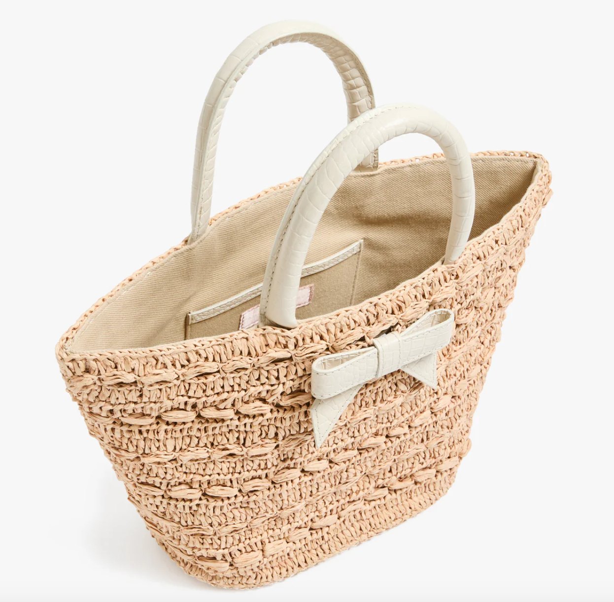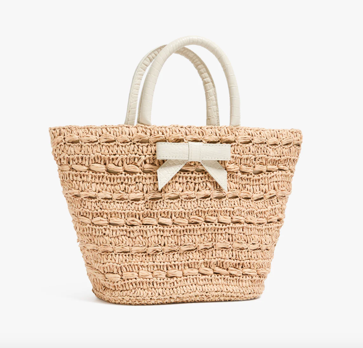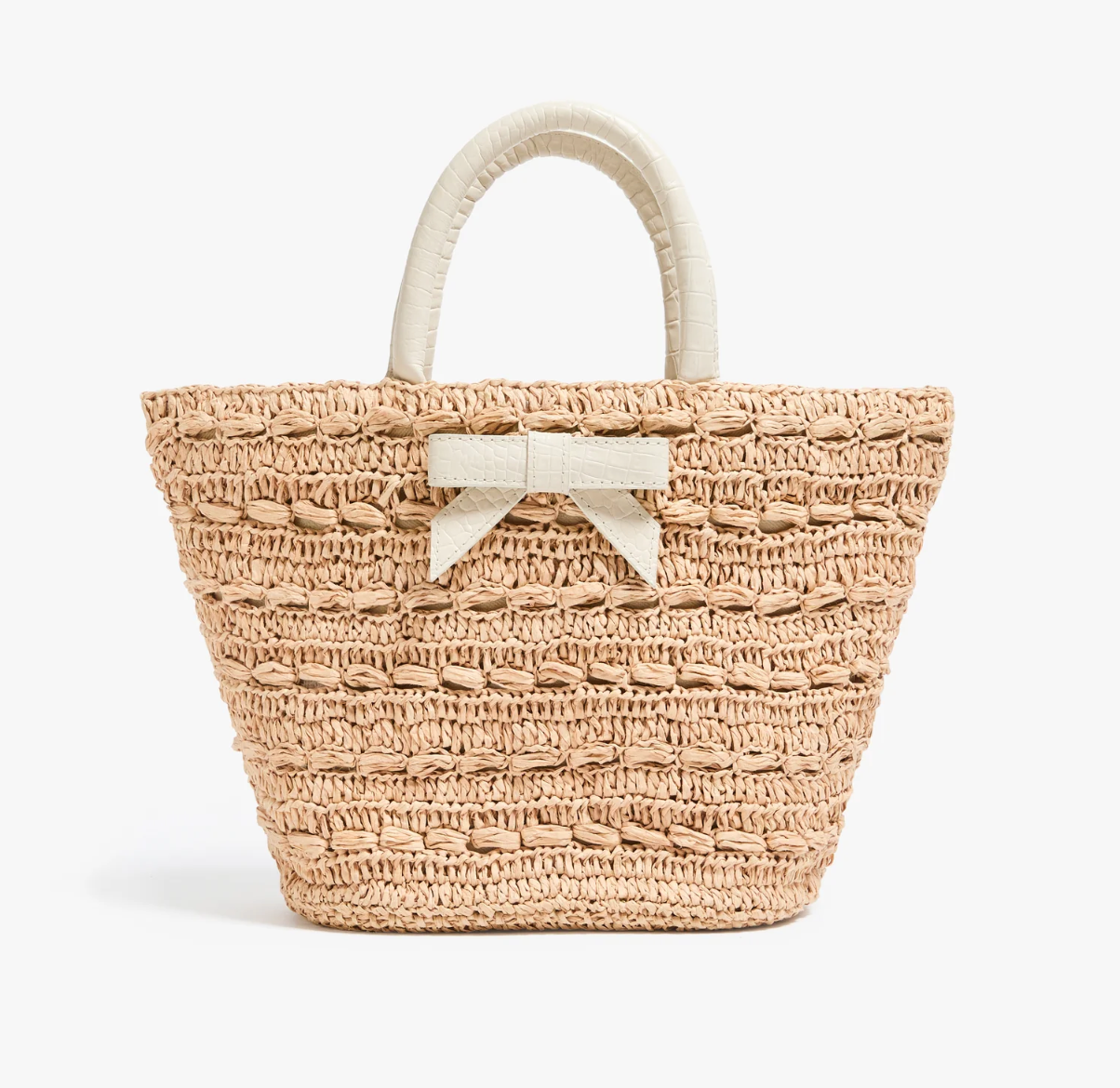 A throwback to retro, 1950s style, The Bow Tote is one for the ages. The Bow Tote blends timeless style with a feminine touch featuring crochet raffia and an embossed croc leather bow detail.