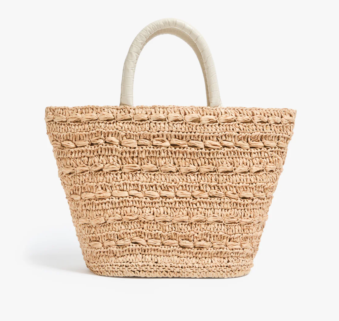 Crochet raffia tote bag with embossed croc leather top handles and bow