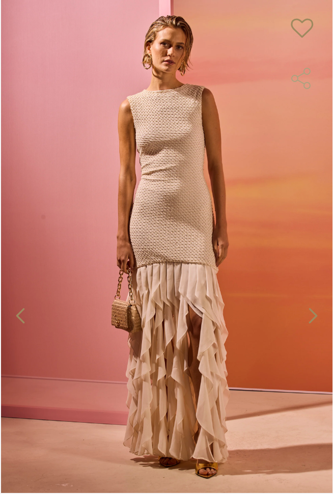 This gown blends timeless elegance with breezy sensuality. The textured bodice sculpts the figure with a clean, sleeveless silhouette, while the skirt flows into cascading ruffles that move effortlessly with every step. The high-low hem reveals just the right amount of leg, perfect for a barefoot walk on the sand at sunset or a golden-hour toast by the sea.