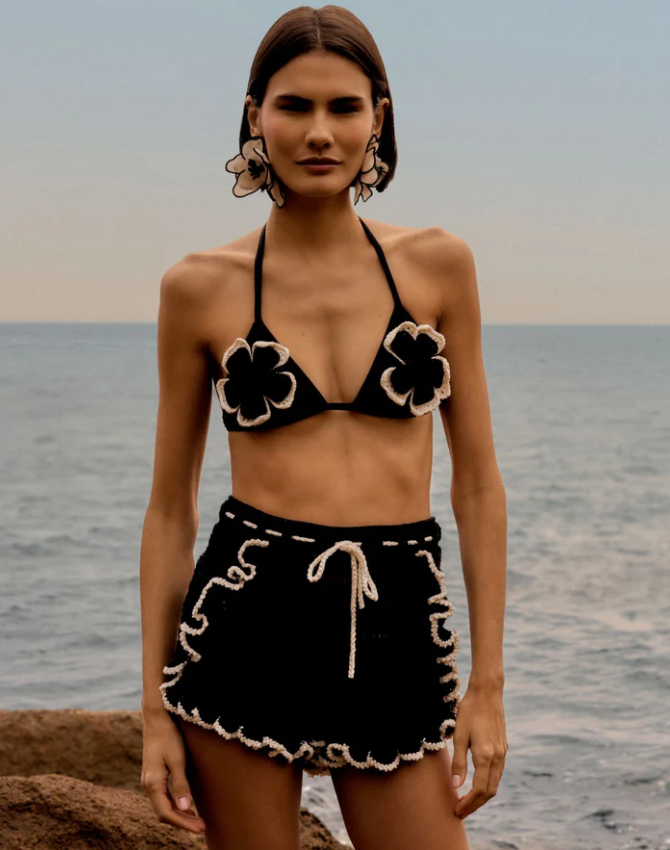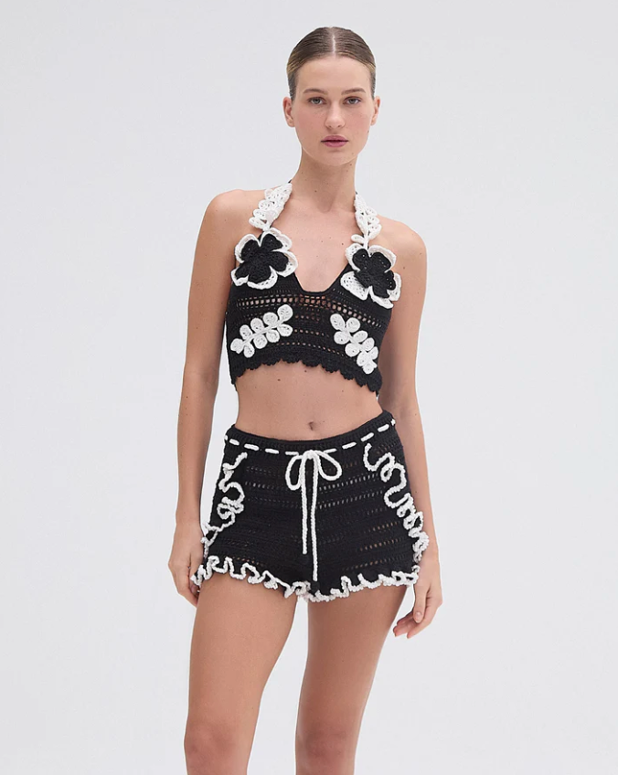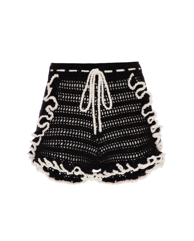 These shorts are fully handmade in our poppy crochet material which is a new technique that allow each to be uniquely made. They feature a ruffle hemline, flutter detail and tie waist closure.